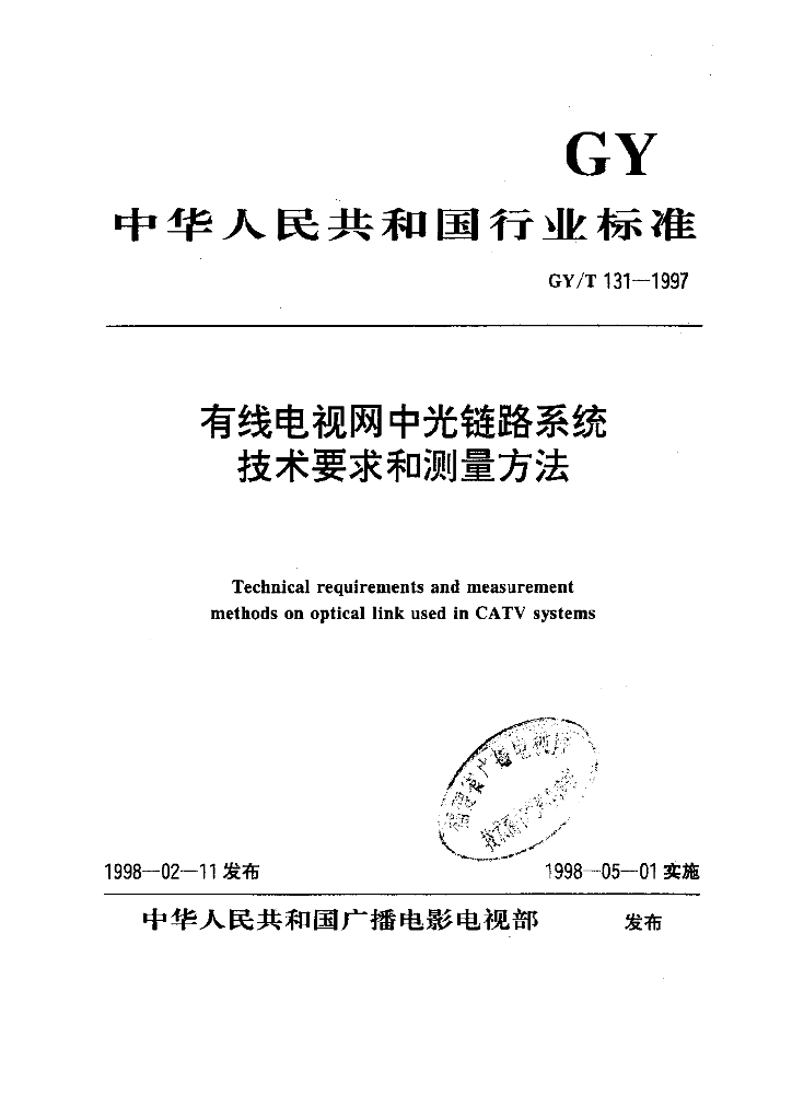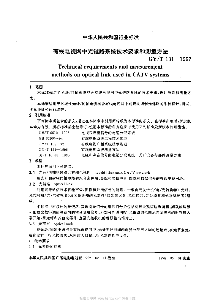 GY/T 131-1997 有线电视网中光链路系统技术要求和测量方法