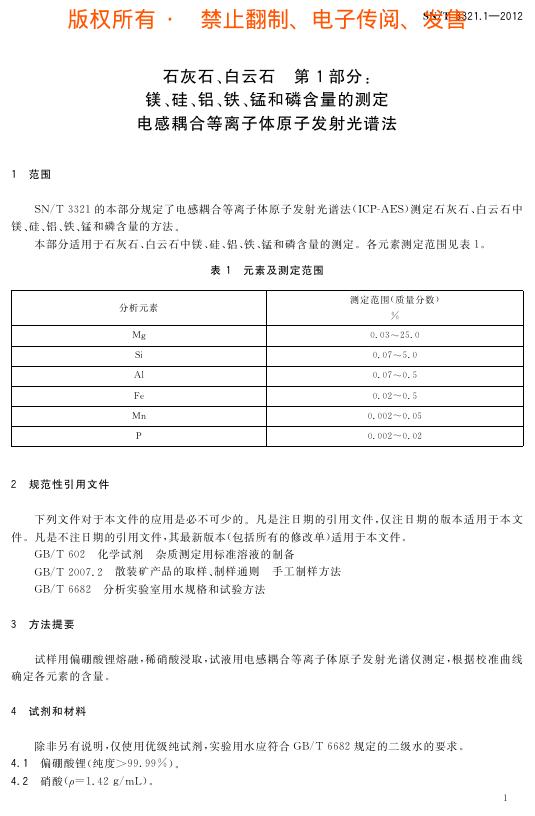 SN/T 3321.1-2012 石灰石、白云石 第1部分:镁、硅、铝、铁、锰和磷含量的测定 电感耦合等离子体原子发射光谱法