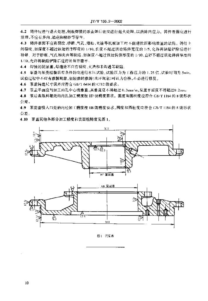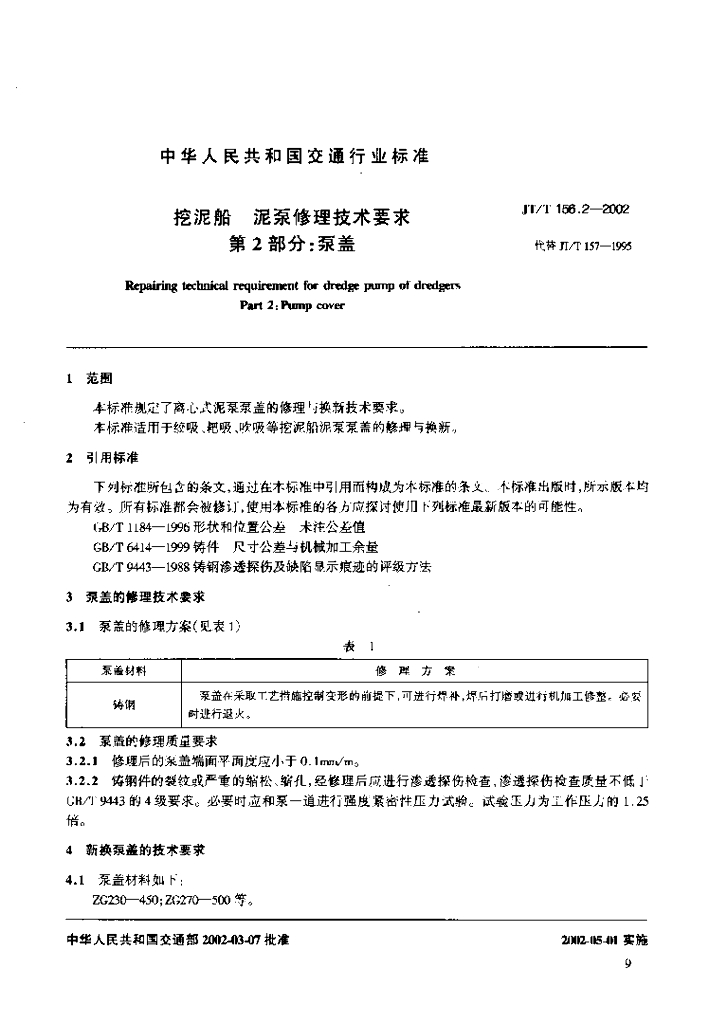 JT/T 156.2-2002 挖泥船泥泵修理技术要求 第2部分:泵盖