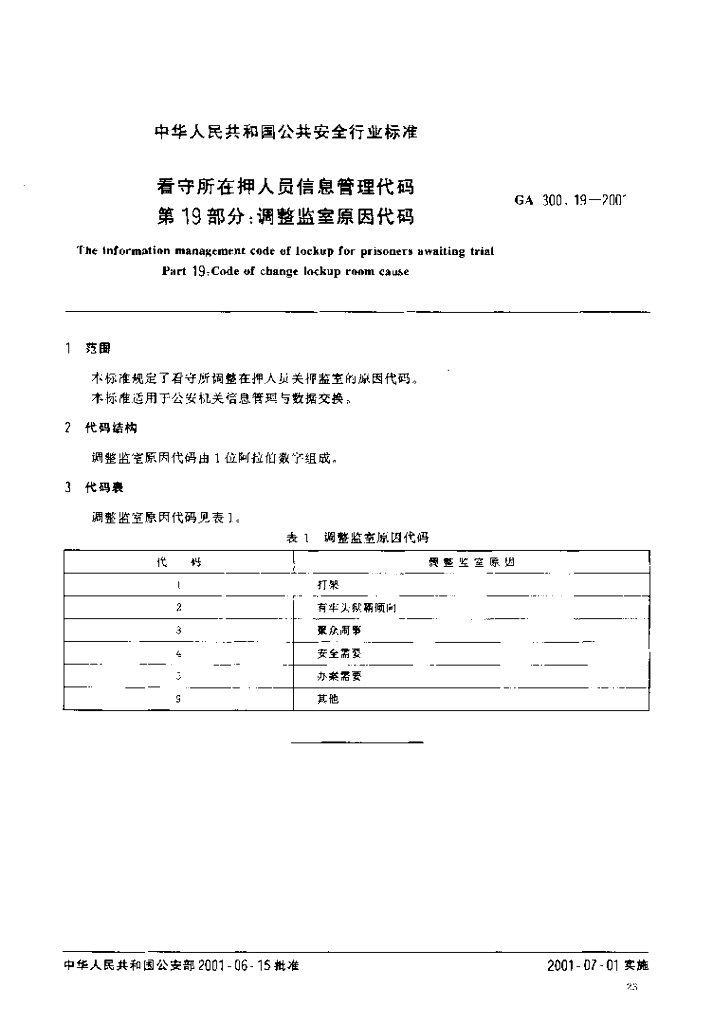 GA 300.19-2001 看守所在押人员信息管理代码 第19部分:调整监室原因代码