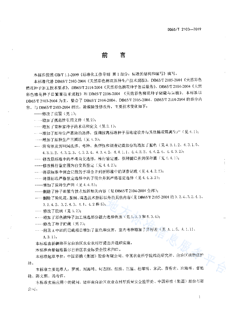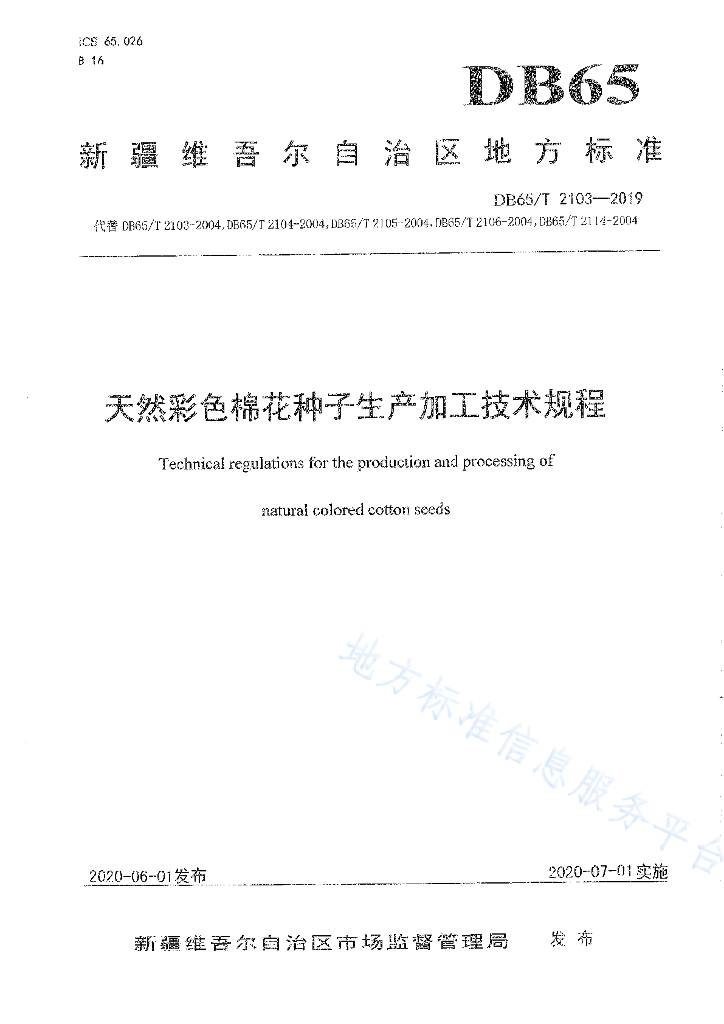 DB65/T 2103-2019 天然彩色棉花种子生产加工技术规程