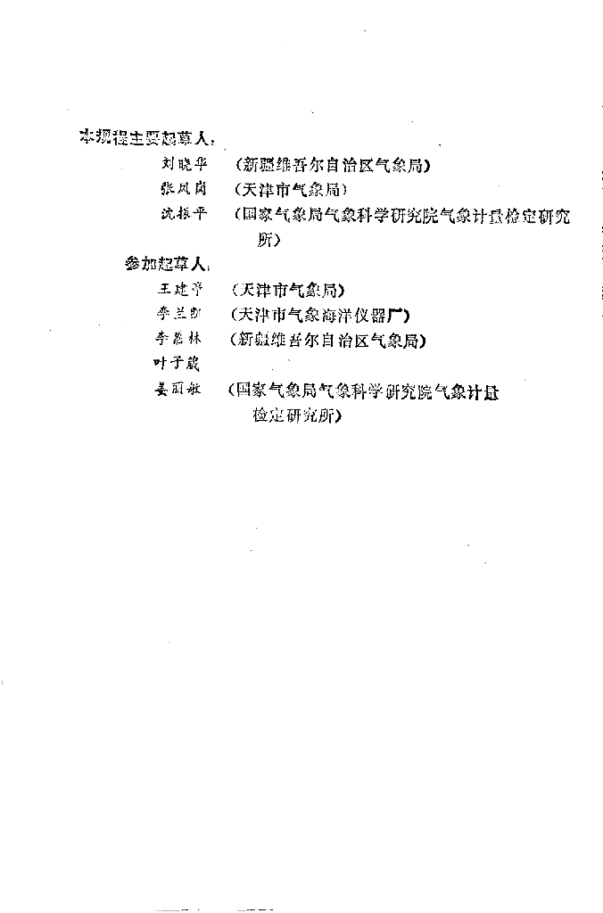 刘晓华(新疆维吾尔自治区气象局)、张风岗(天津市气象局)、沈振平(国家气象局气象科学研究院气象计量检定研究所)、王建亭(天津市气象局)、李兰凯(天津市气象海洋仪器厂)、李慕林(新疆维吾尔自治区气象局)、叶子葳、姜丽敏(国家气象局气象科学研究院气象计量应定研元所)