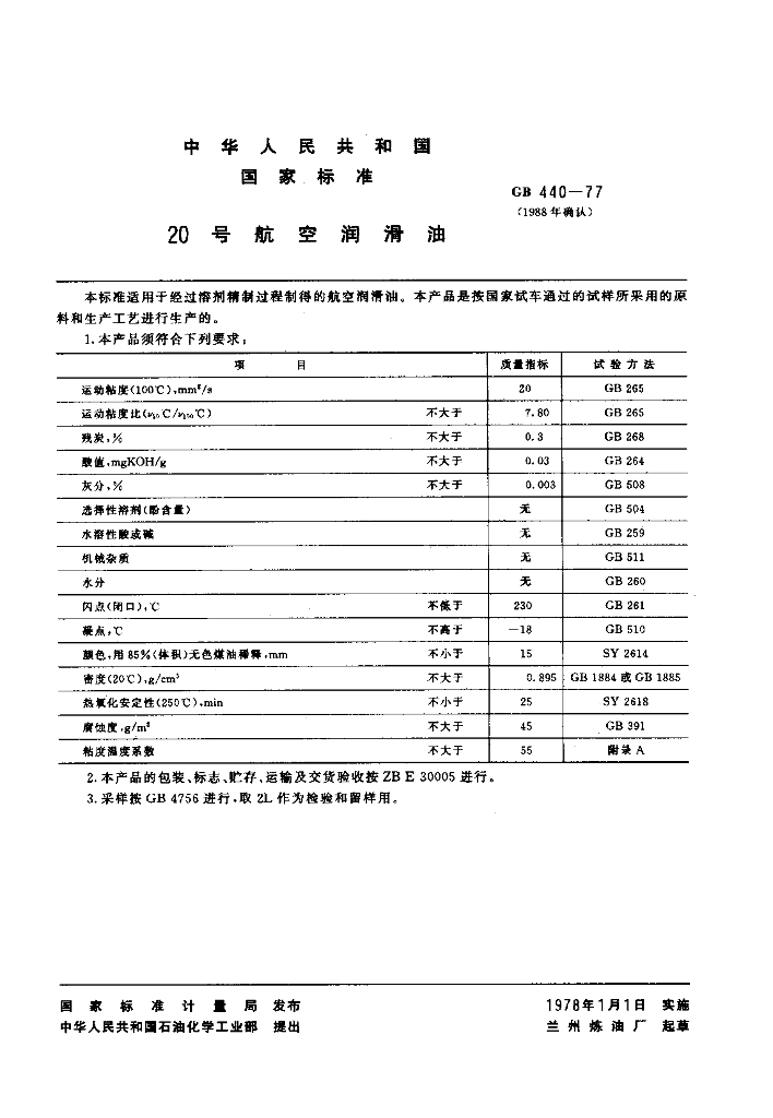 GB 440-1977 20号航空润滑油