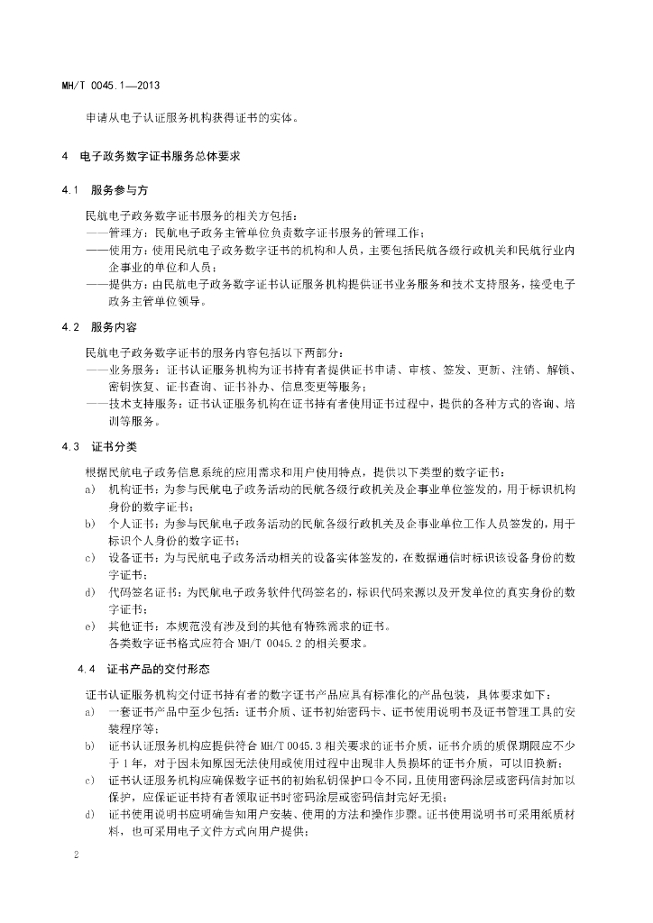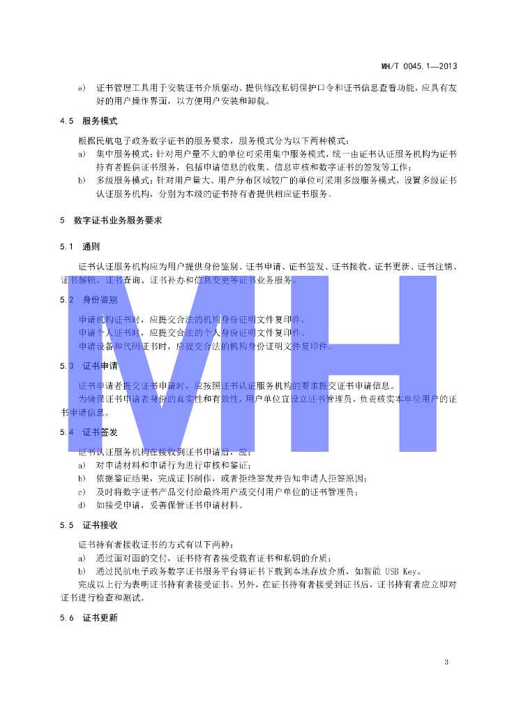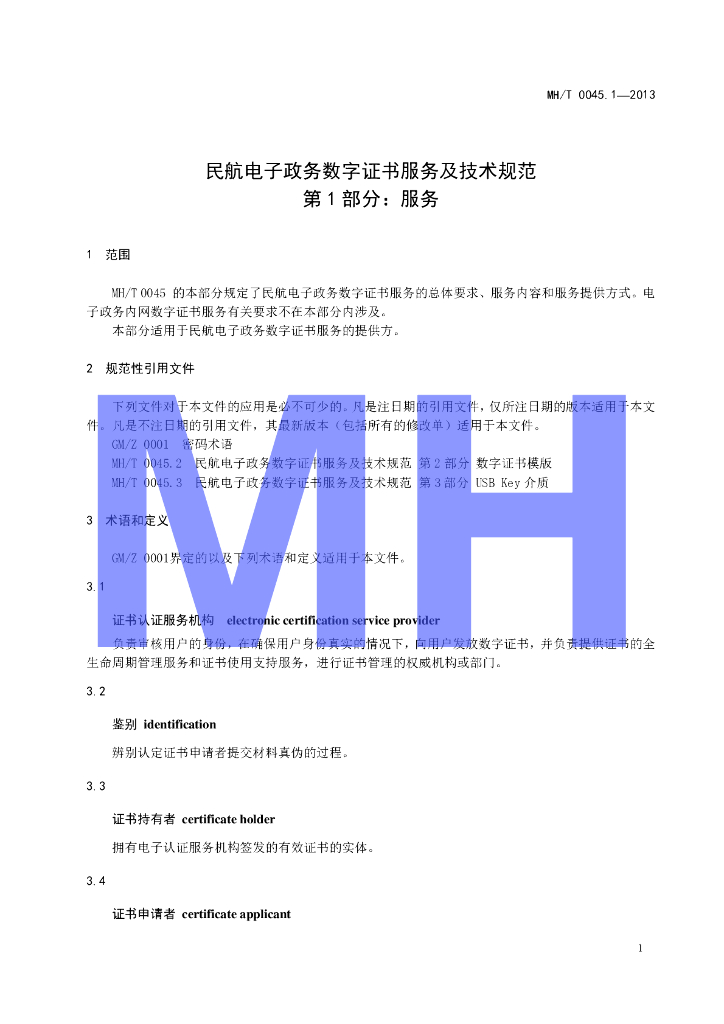 MH/T 0045.1-2013 民航电子政务数字证书服务及技术规范 第1部分:服务