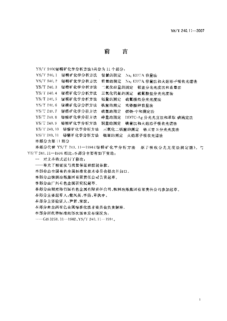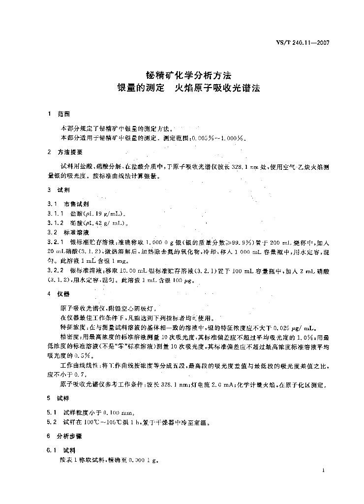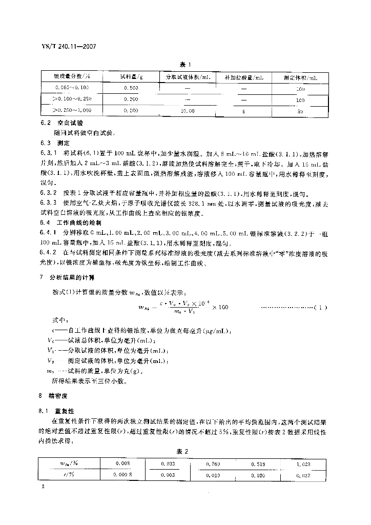 YS/T 240.11-2007 铋精矿化学分析方法 银量的测定 火焰原子吸收光谱法