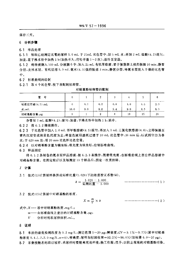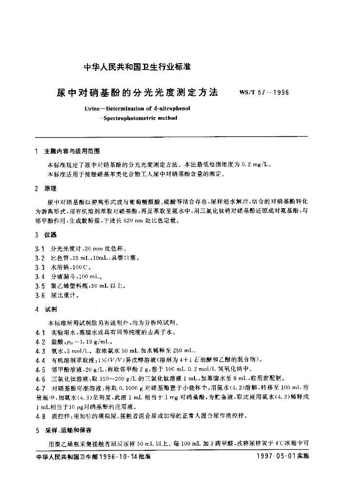 WS/T 57-1996 尿中对硝基酚的分光光度测定方法