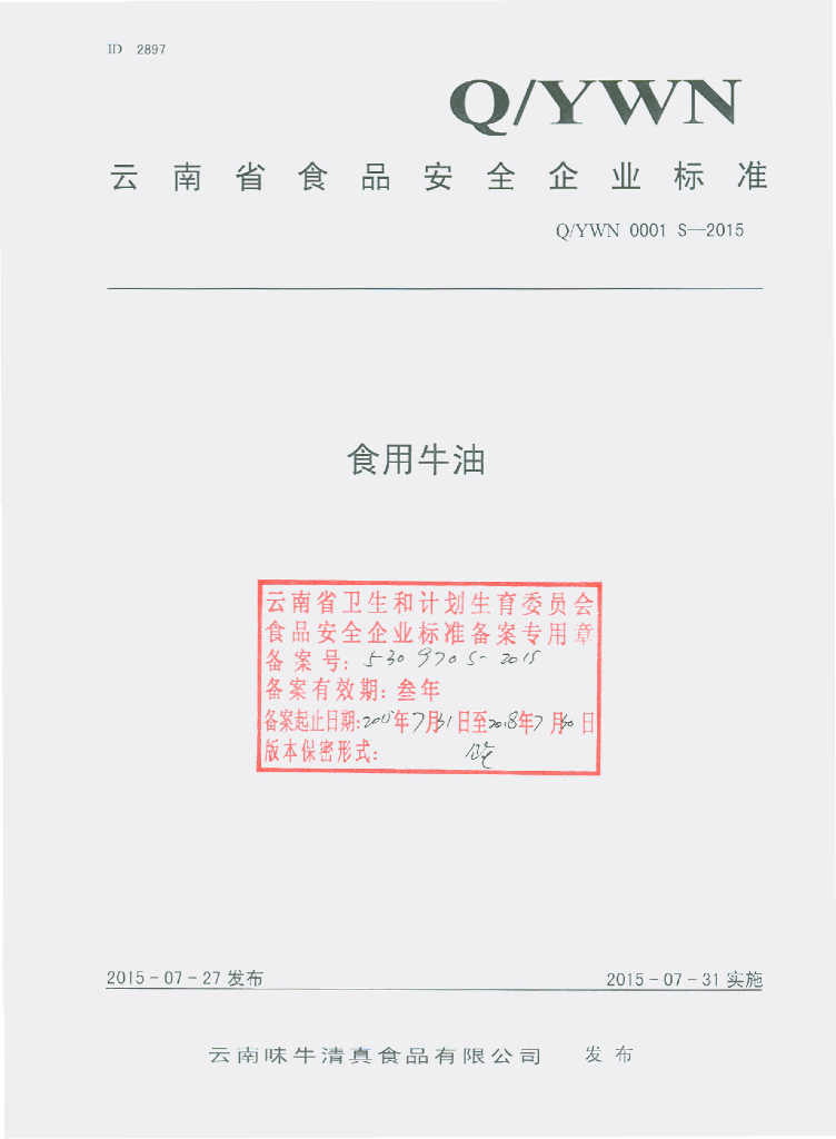 Q/YWN 0001S-2015 云南味牛清真食品有限公司 食用牛油