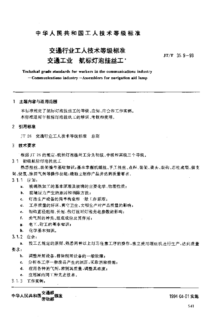 JT/T 35.9-1993 交通行业工人技术等级标准交通工业航标灯泡挂丝工