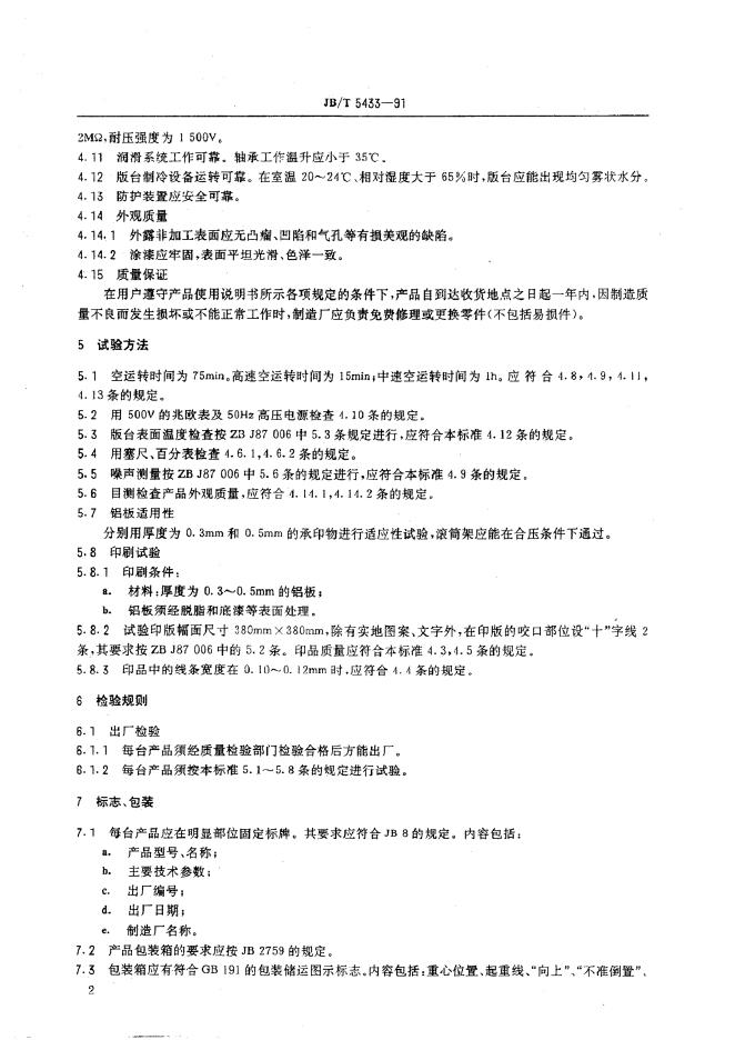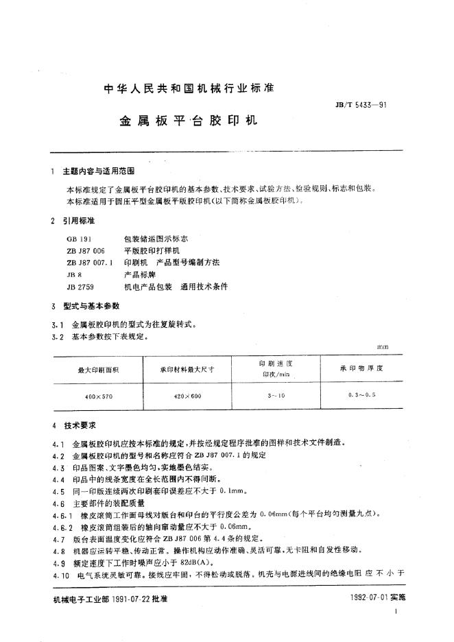 JB/T 5433-1991 金属板平台胶印机