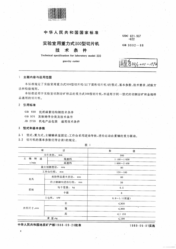DZ/T 0111-1994 实验室用重力式300型切片机技术条件