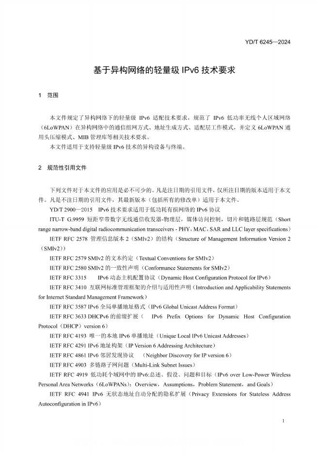 YD/T 6245-2024 基于异构网络的轻量级IPv6技术要求