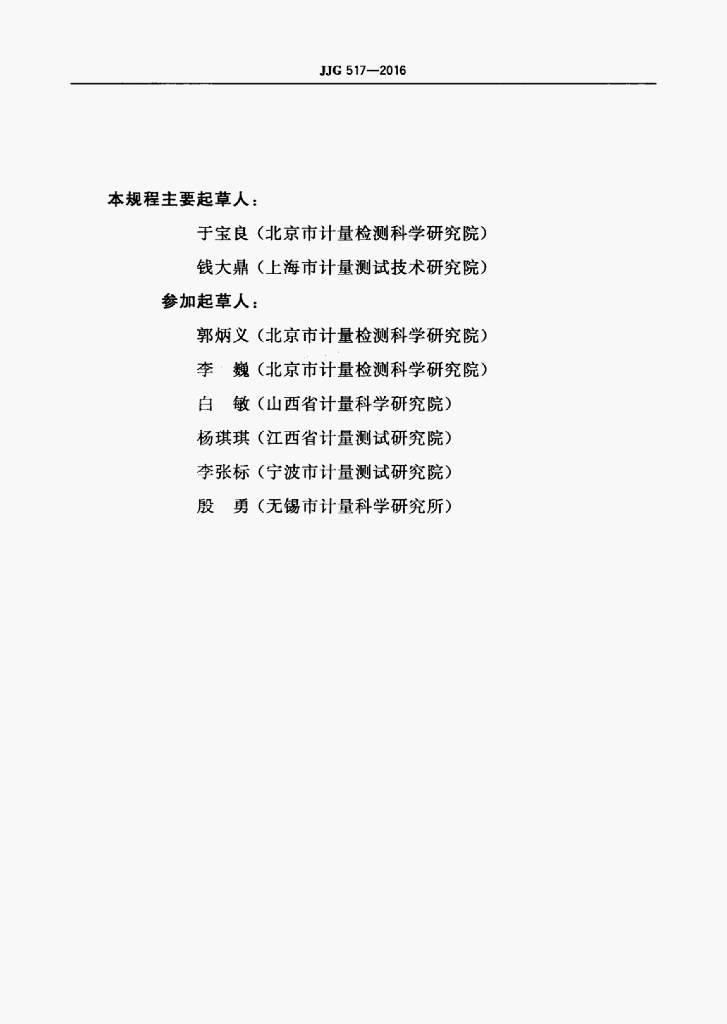 于宝良(北京市计量检测科学研究院)、钱大鼎(上海市计量测试技术研究院)、郭炳义(北京市计量检测科学研究院)、李巍(北京市计量检测科学研究院)、白敏(山西省计量科学研究院)、杨琪琪(江西省计量测试研究院)、李张标(宁波市计量测试研究院)、殷勇(无锡市计量科学研究所)