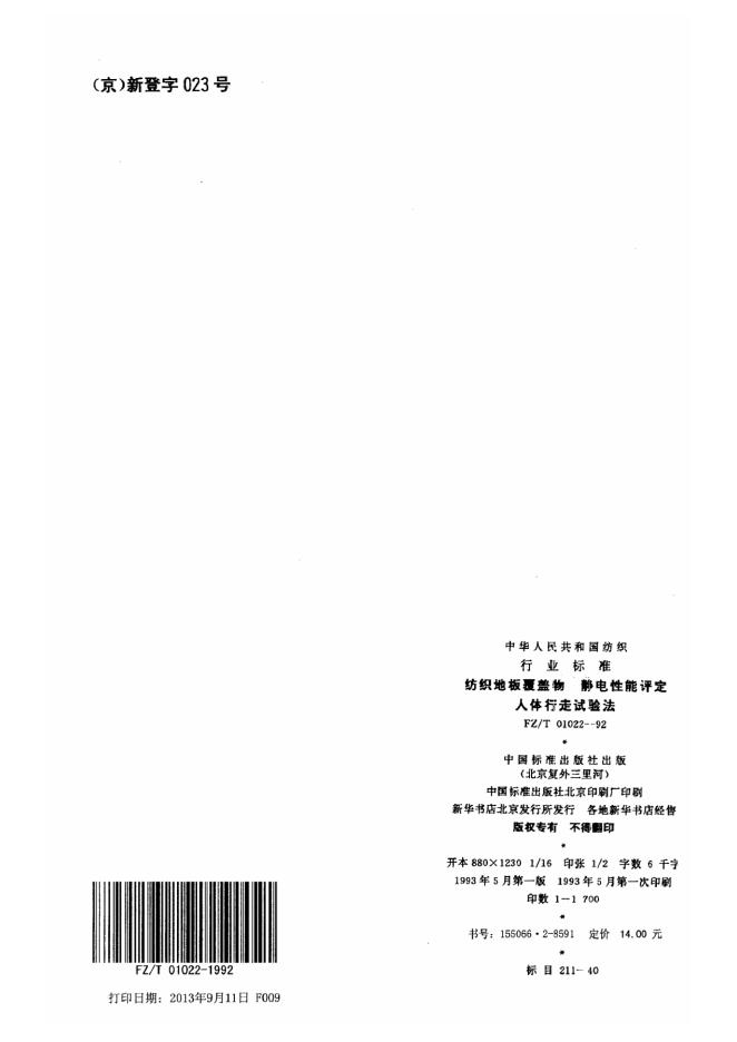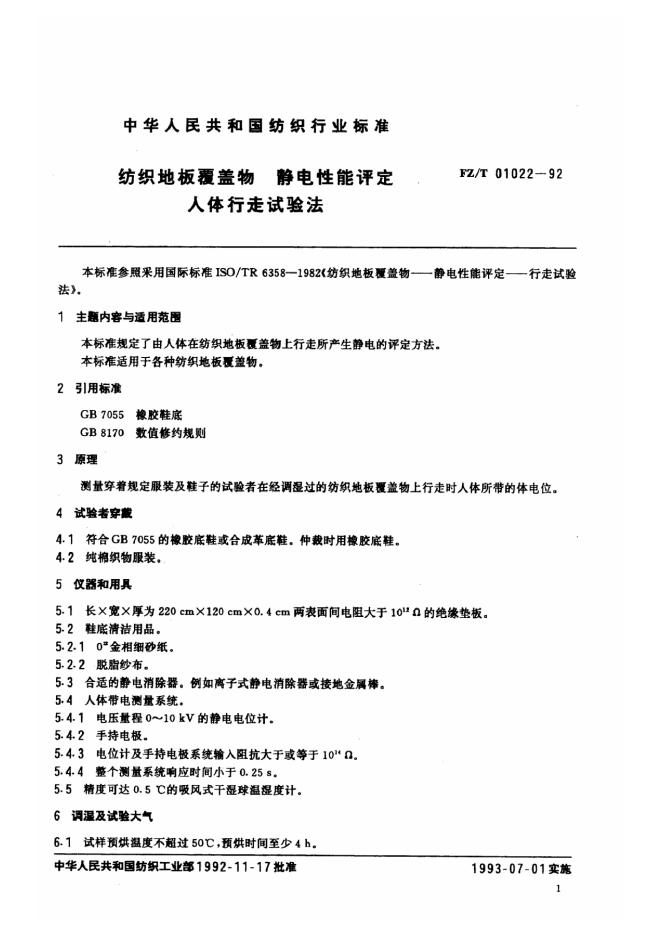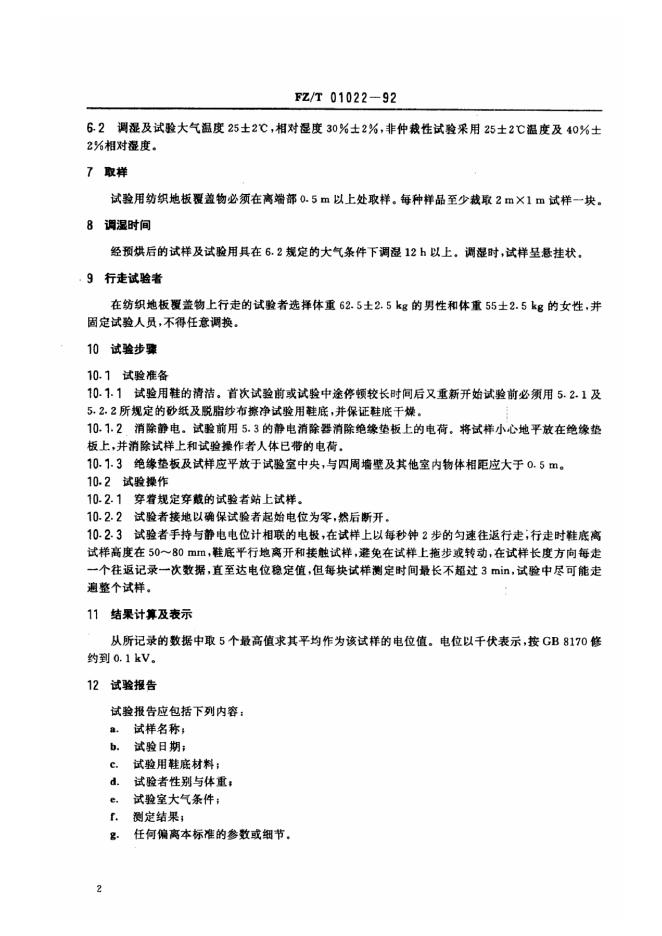 FZ/T 01022-1992 纺织地板覆盖物静电性能评定--人体行走试验方法