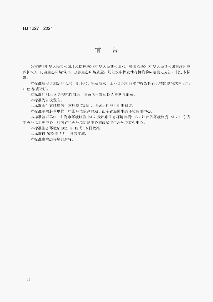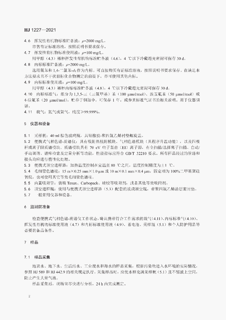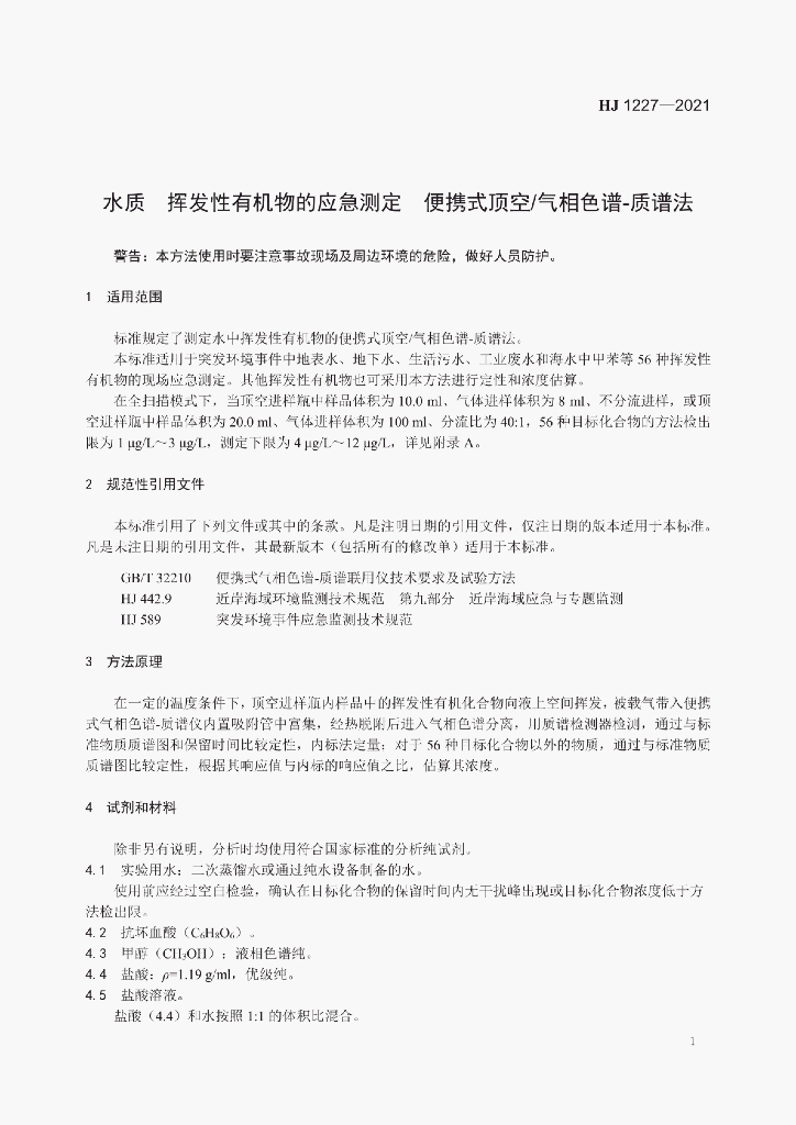 HJ 1227-2021 水质 挥发性有机物的应急测定 便携式顶空/气相色谱-质谱法