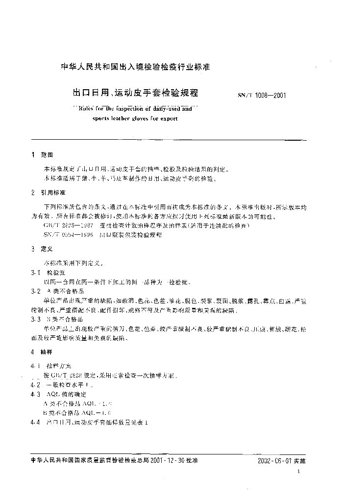 SN/T 1008-2001 出口日用、运动皮手套检验规程