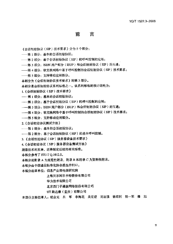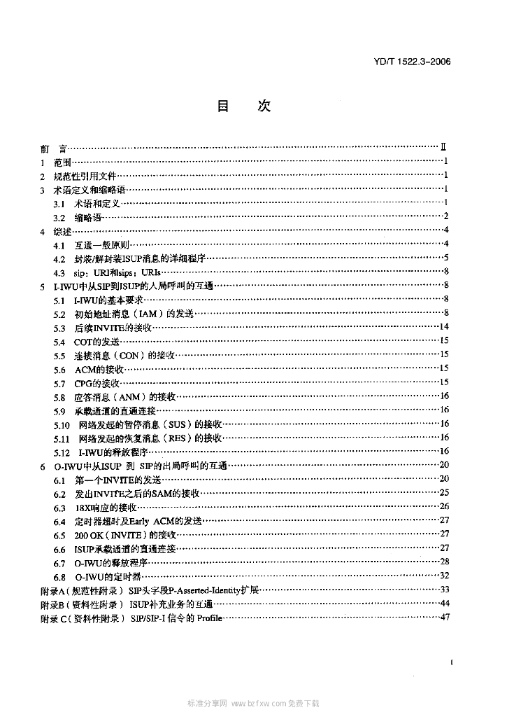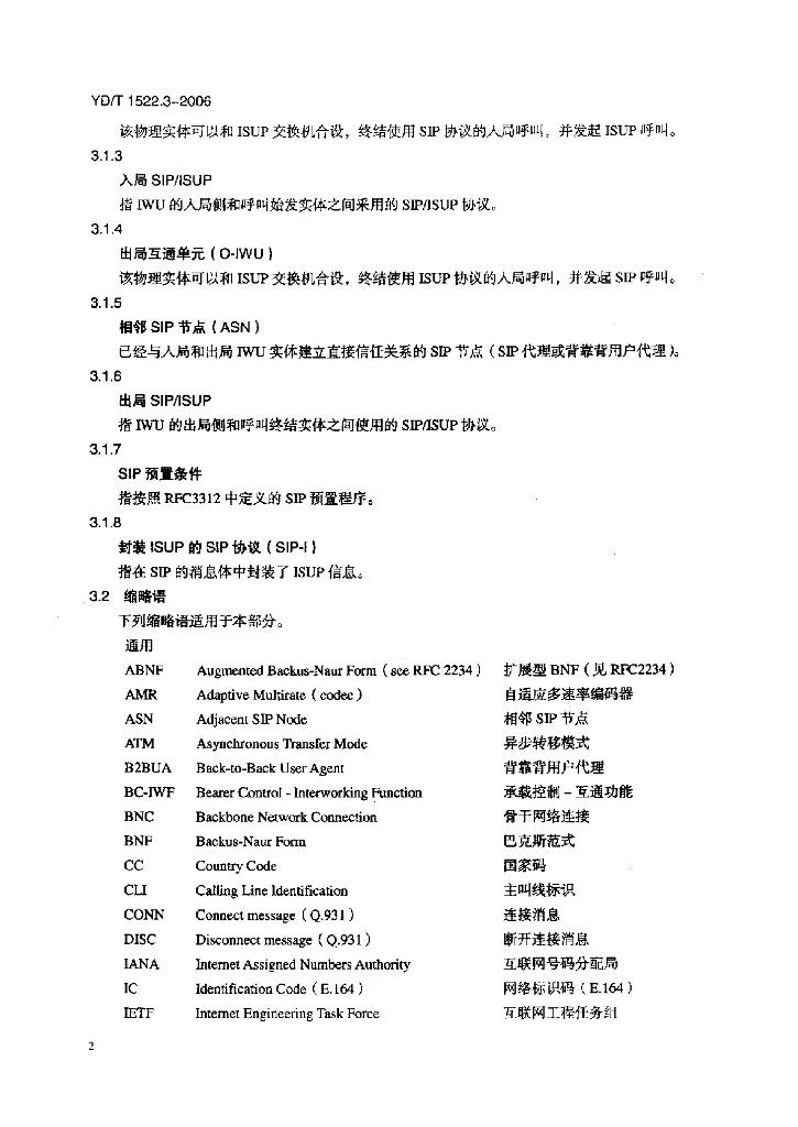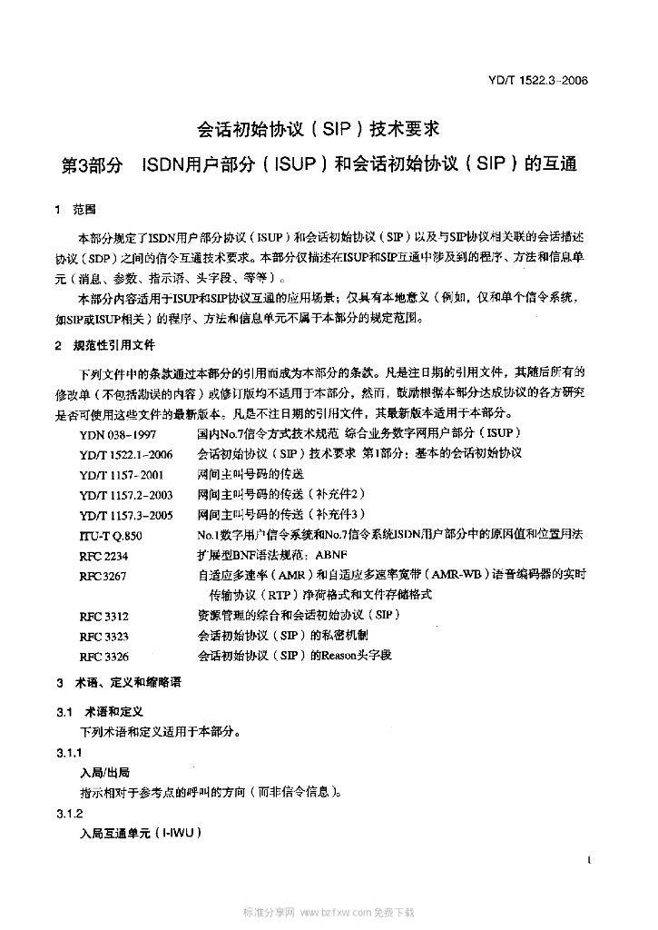 YD/T 1522.3-2006 会话初始协议(SIP)技术要求 第3部分:ISDN 用户部分(ISUP)和会话初始协议(SIP)的互通