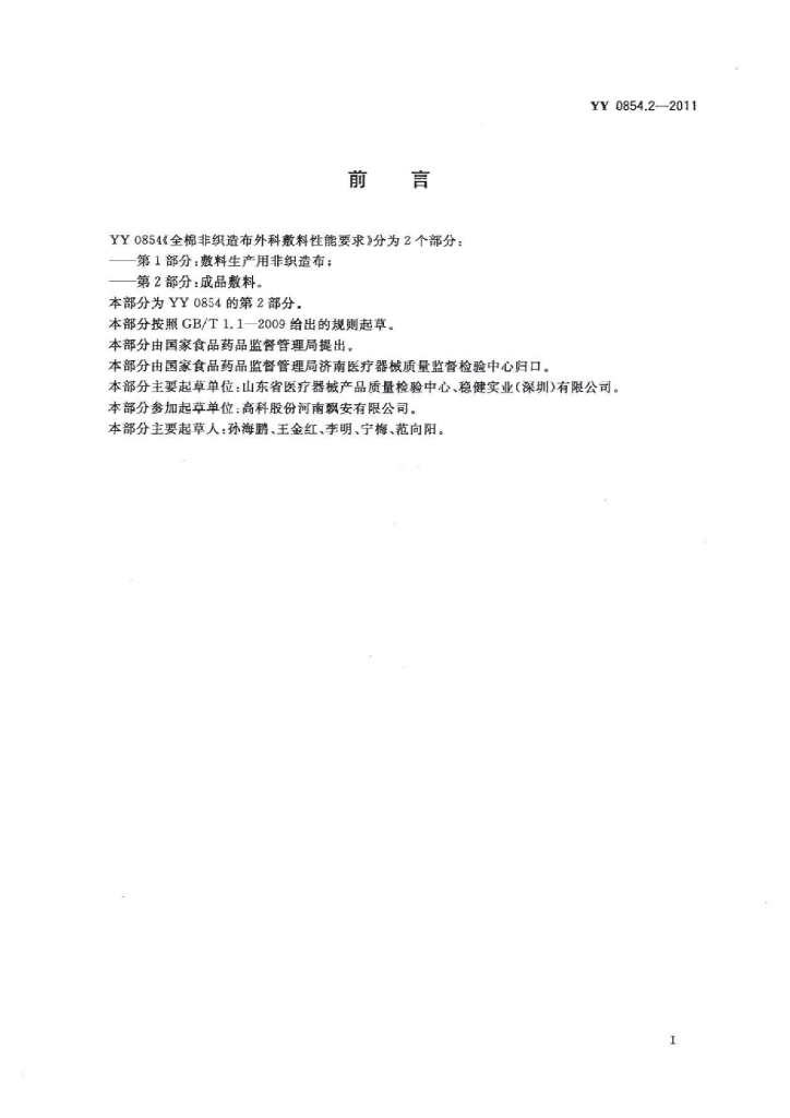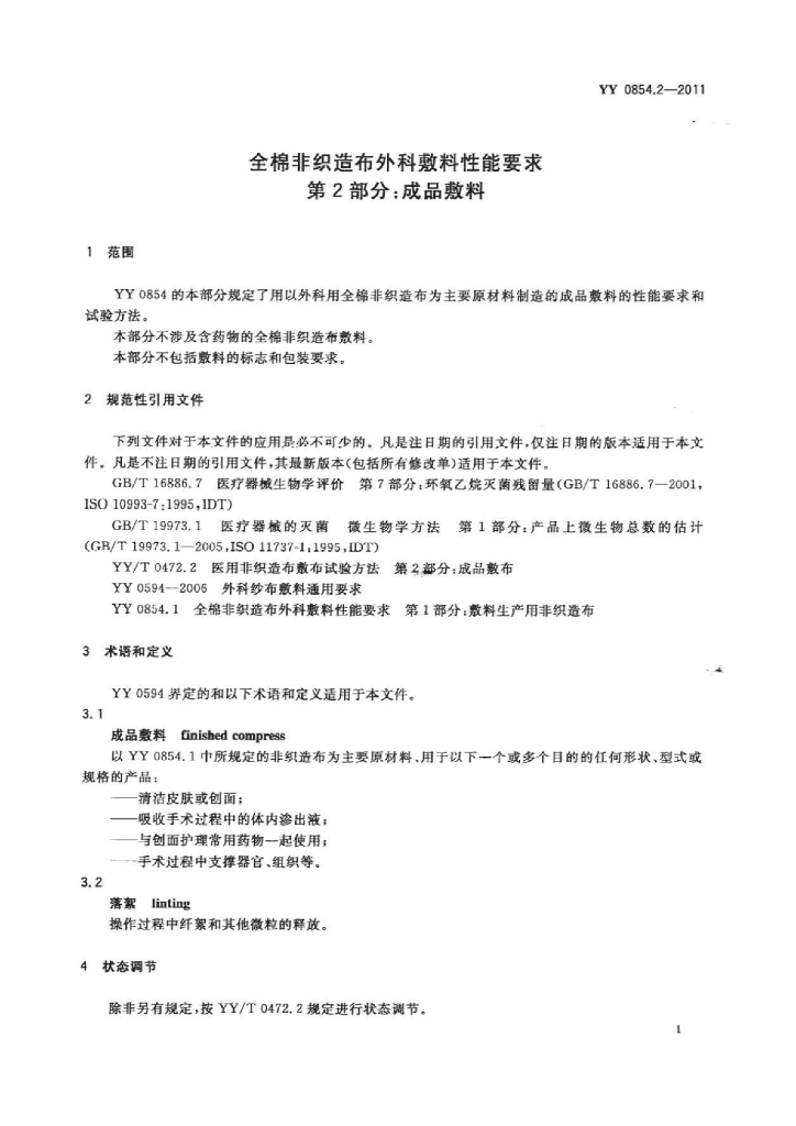 YY 0854.2-2011 全棉非织造布外科敷料性能要求 第2部分:成品敷料