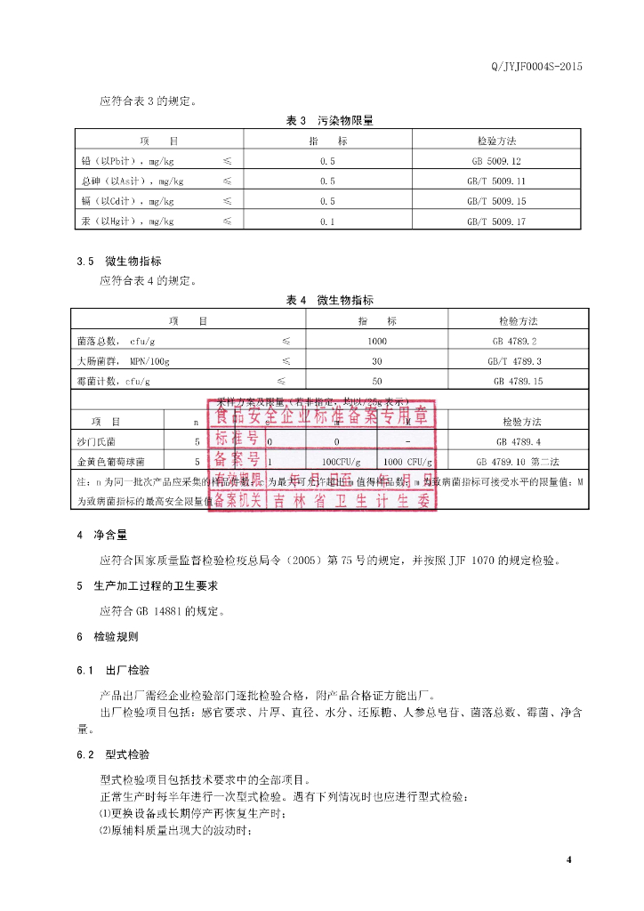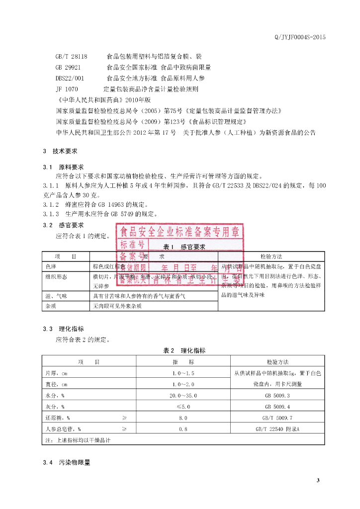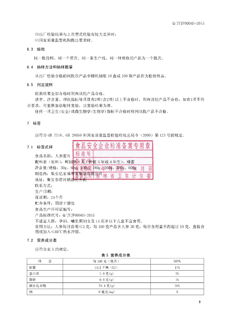 Q/JYJF 0004S-2015 集安亿家福参茸制品有限公司 人参蜜片
