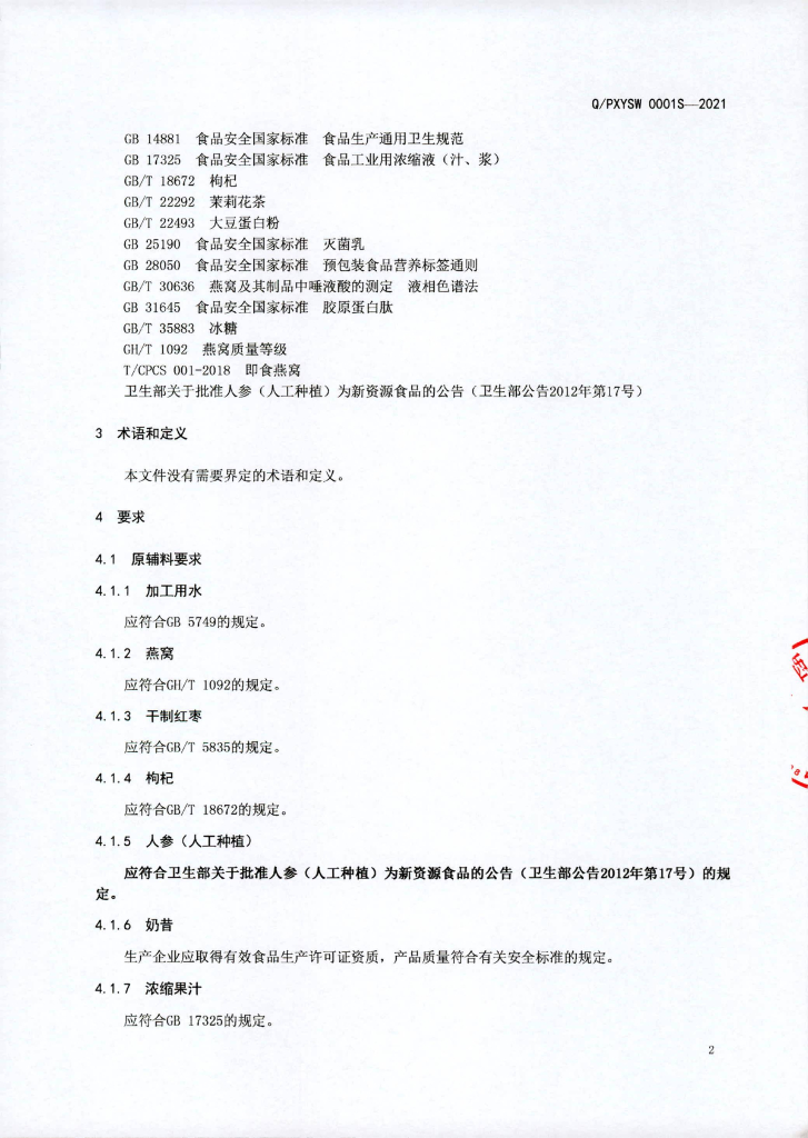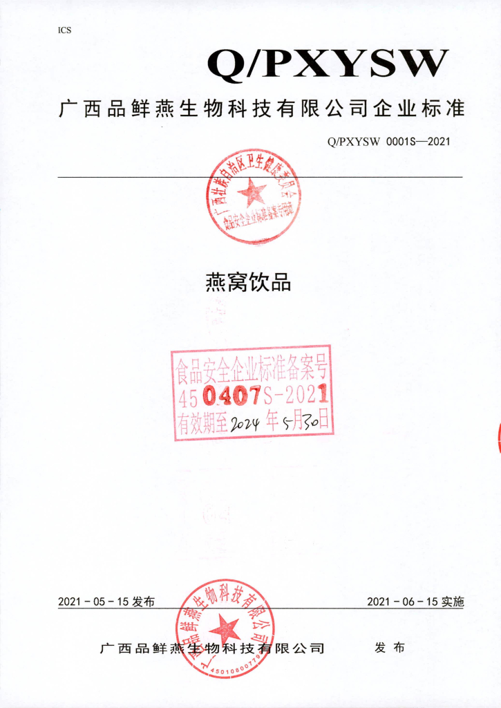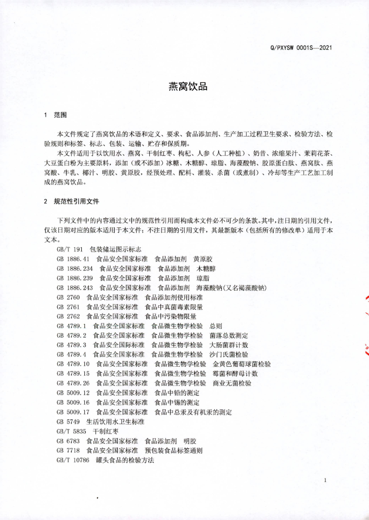 Q/PXYSW 0001S-2021 燕窝饮品