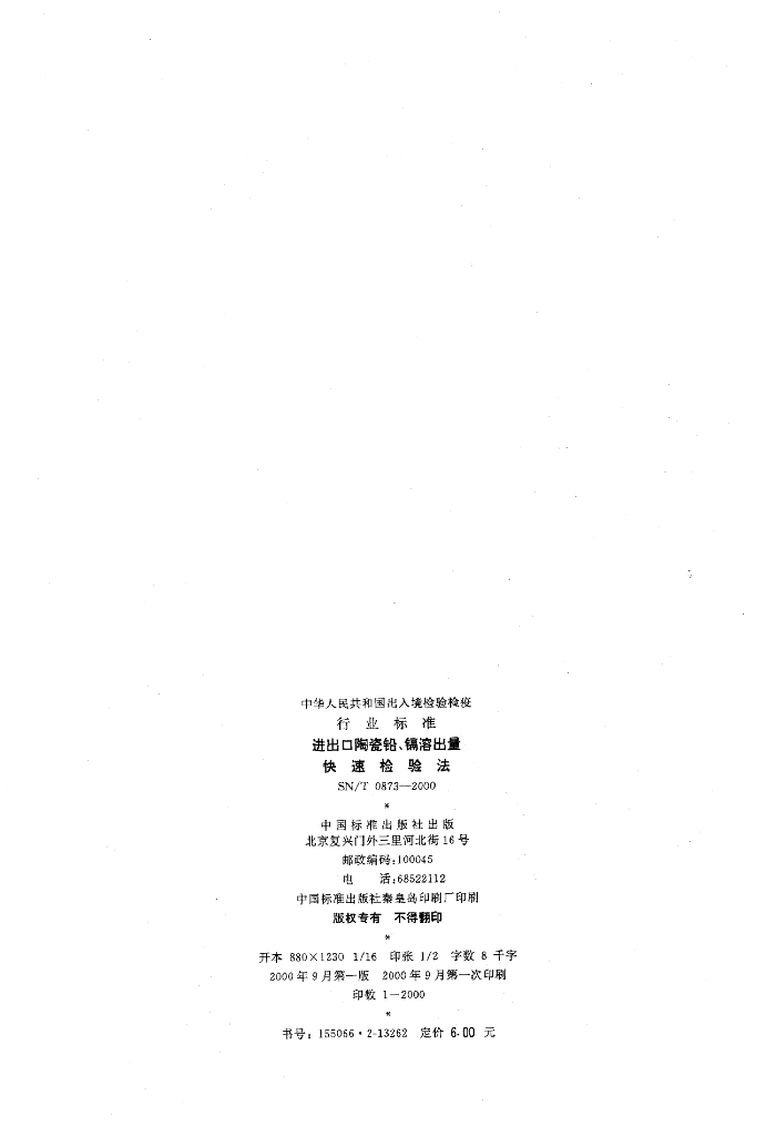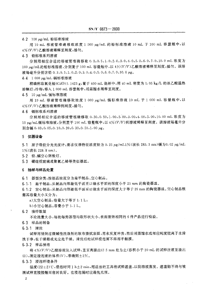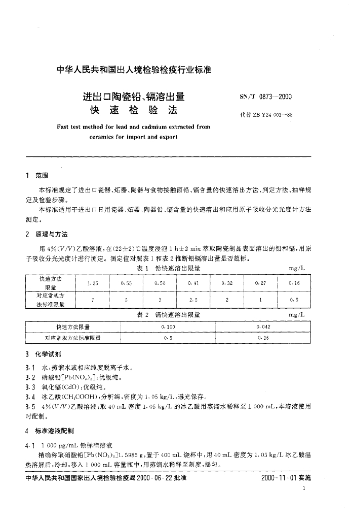 SN/T 0873-2000 进出口陶瓷铅、镉溶出量快速检验法