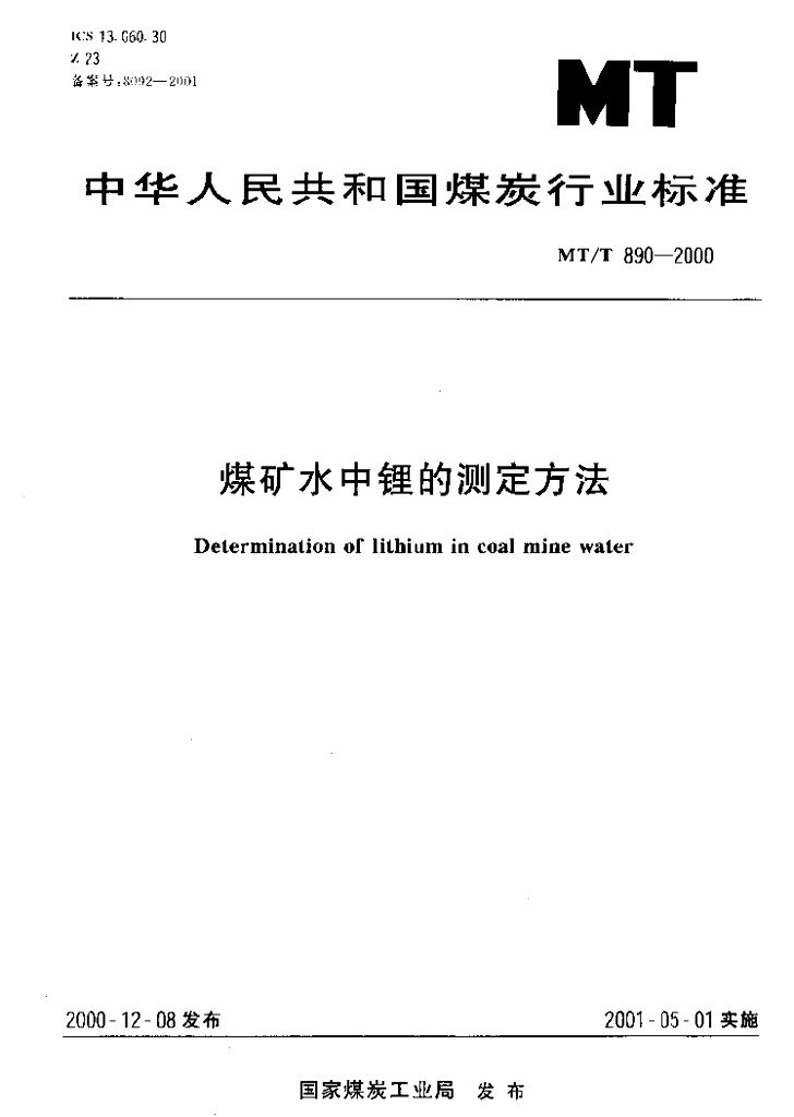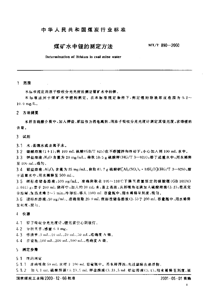 MT/T 890-2000 煤矿水中锂的测定方法
