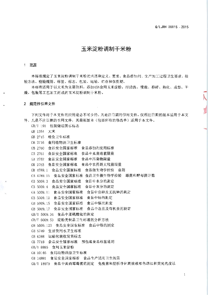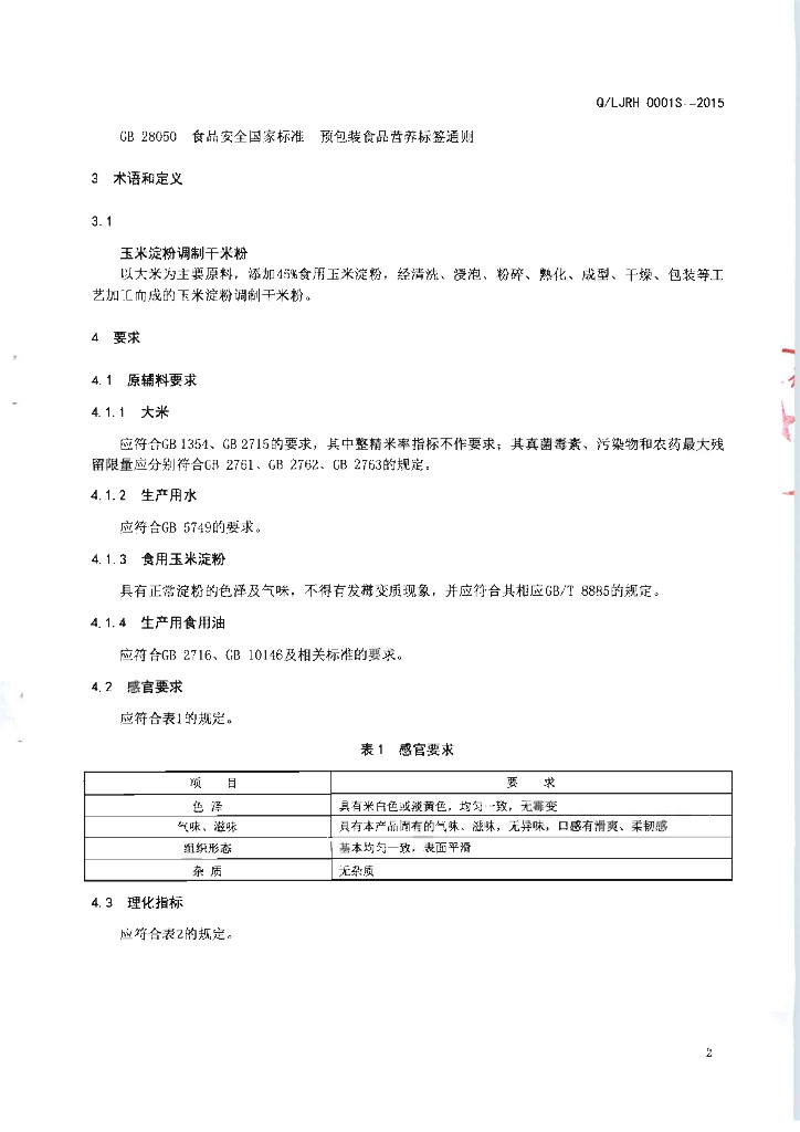 Q/LJRH 0001S-2015 柳江县人和米粉厂 玉米淀粉调制干米粉
