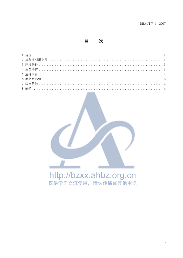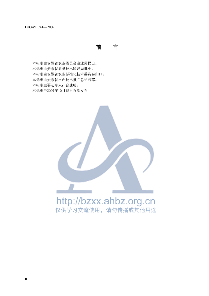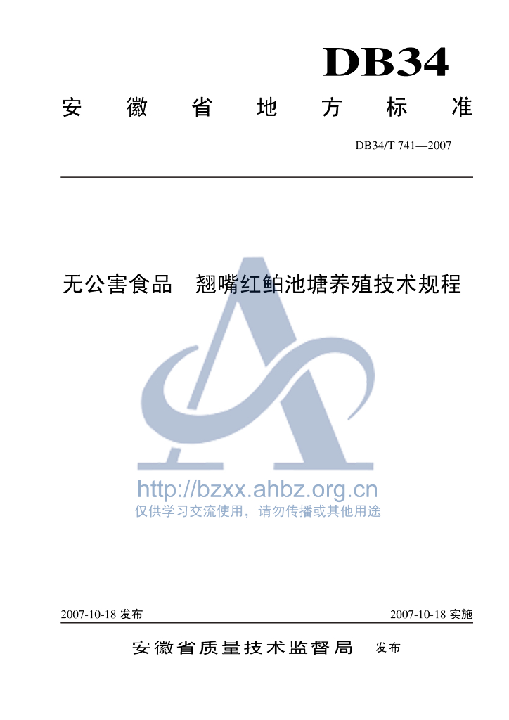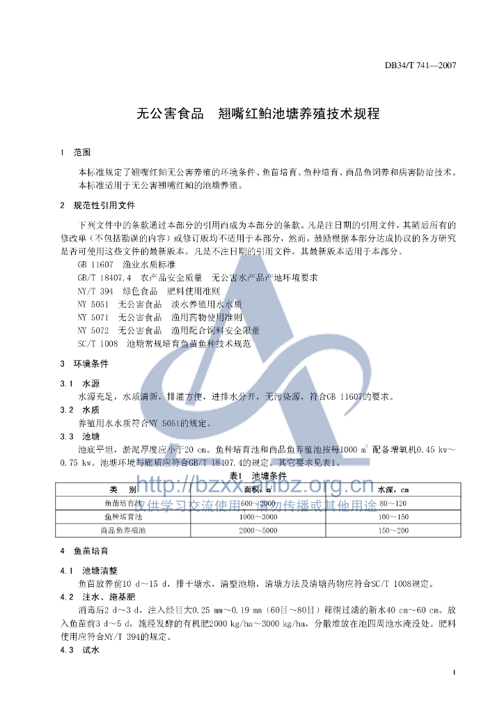 DB34/T 741-2007 无公害食品 翘嘴红鲌池塘养殖技术规程
