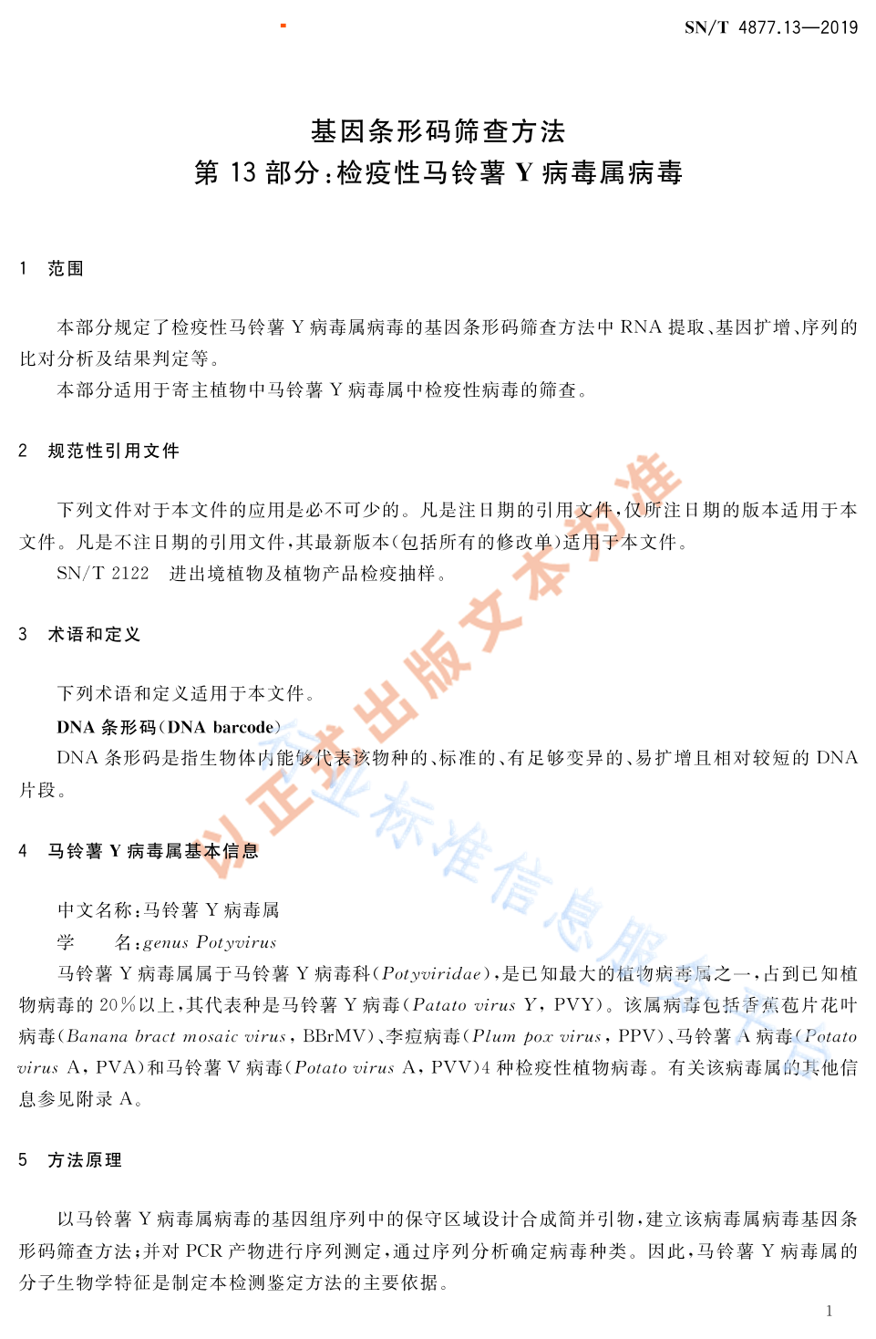 SN/T 4877.13-2019 基因条形码筛查方法 第13部分:检疫性马铃薯Y病毒属病毒