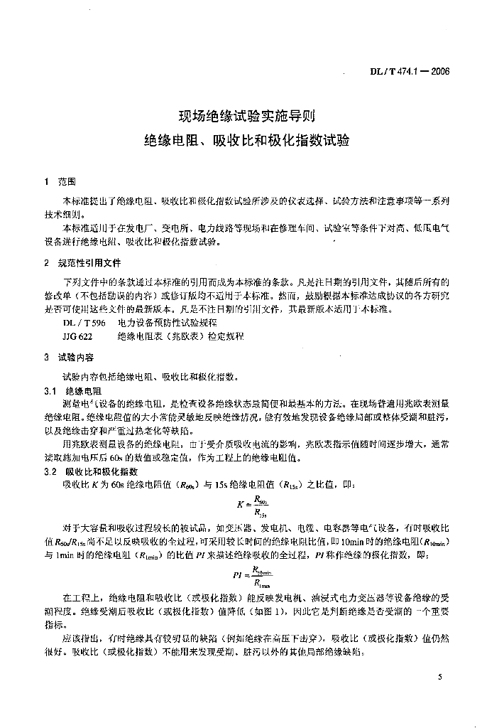 DL/T 474.1-2006 现场绝缘试验实施导则 绝缘电阻、吸收比和极化指数试验