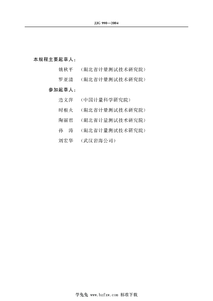 姚秋平(湖北省计量测试技术研究院)、罗亚清(湖北省计量测试技术研究院)、边文萍(中国计量科学研究院)、时根火(湖北省计量测试技术研究院)、陶丽君(湖北省计量测试技术研究院)、孙涛(湖北省计量测试技术研究院)、刘宏华(武汉岩海公司)