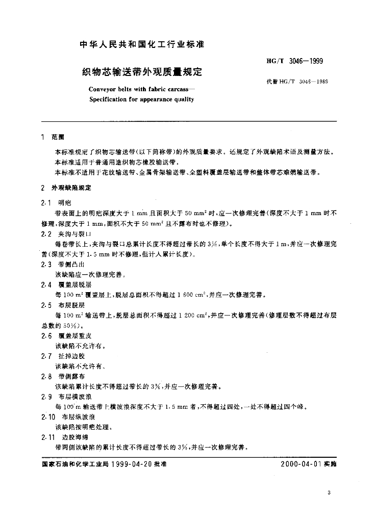 HG/T 3046-1999 织物芯输送带外观质量规定