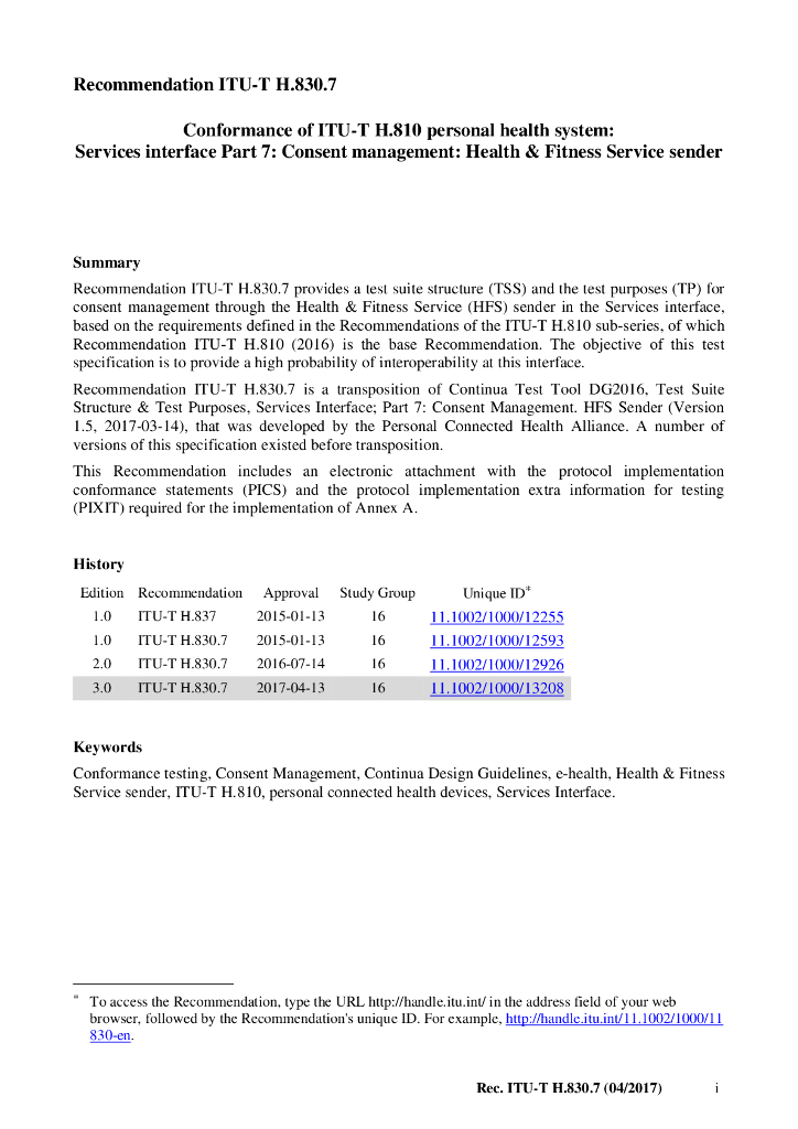 ITU-T H.830.7-2017 ITU-T H.810个人医疗卫生系统一致性 服务接口 第7部分 许可指令管理 健康和健身服务发送器