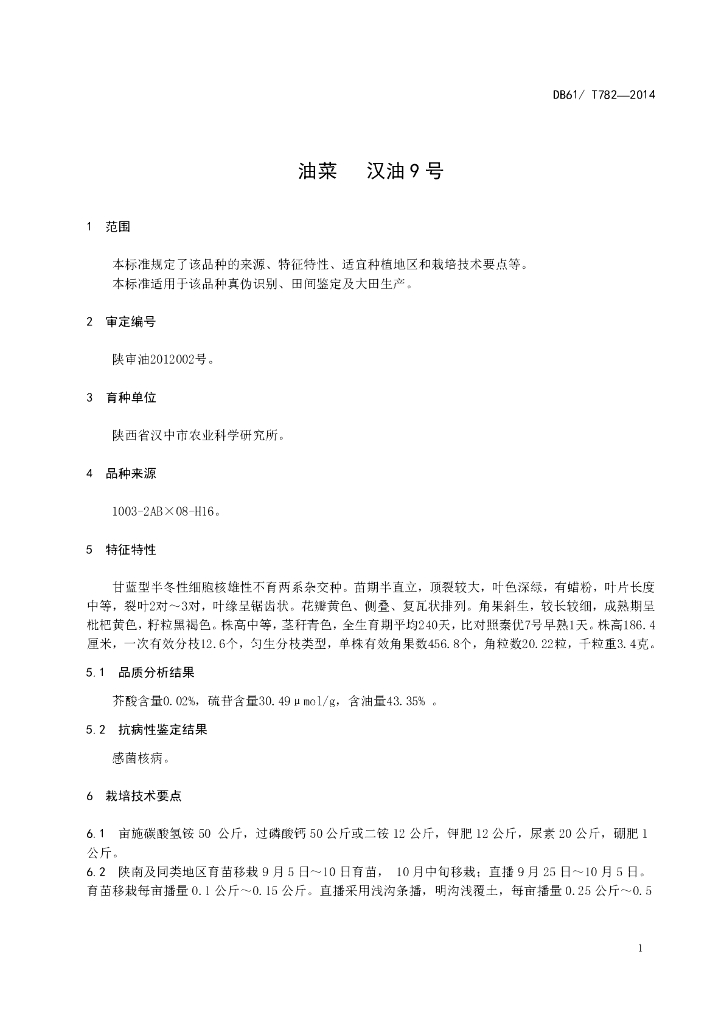 DB61/T 782-2014 油菜 汉油9号
