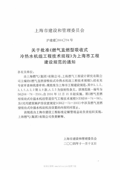 DGJ 08-74-2004 燃气直燃型吸收式冷热水机组工程技术规程