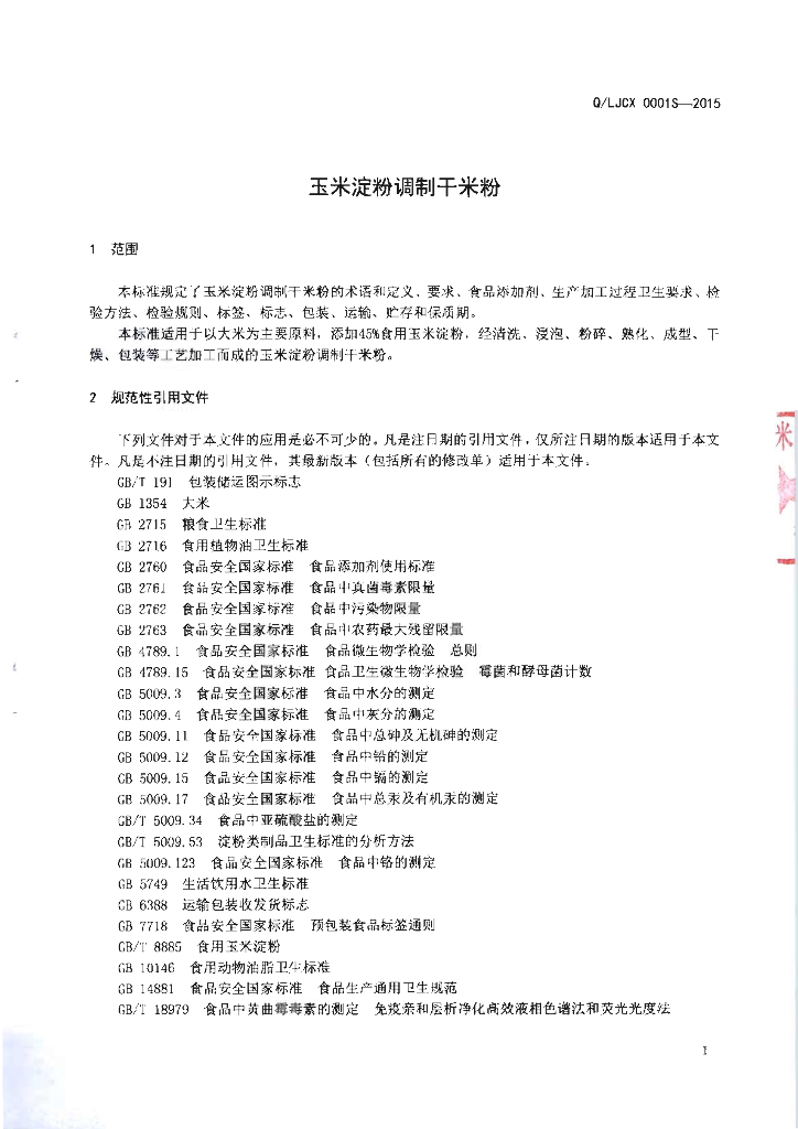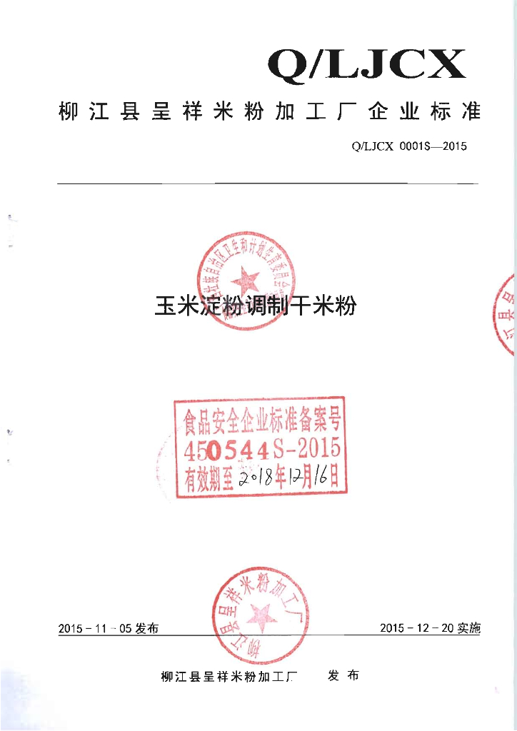 Q/LJCX 0001S-2015 柳江县呈祥米粉加工厂 玉米淀粉调制干米粉