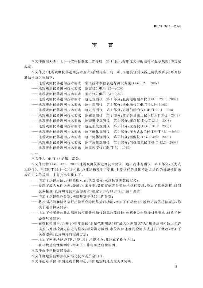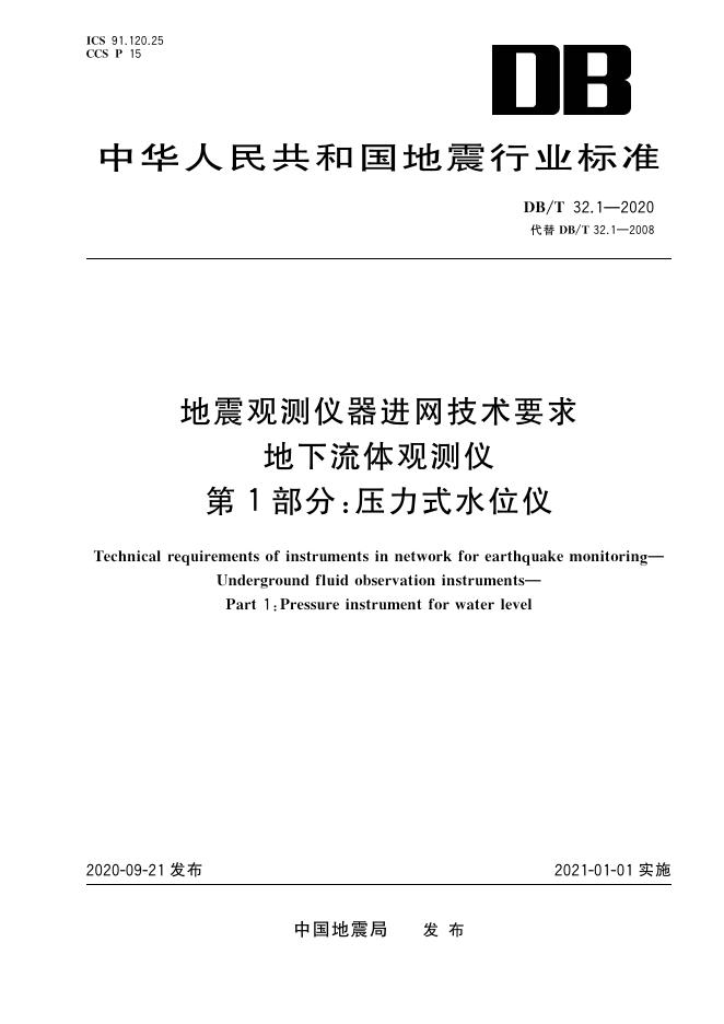 DB/T 32.1-2020 地震观测仪器进网技术要求 地下流体观测仪 第1部分:压力式水位仪