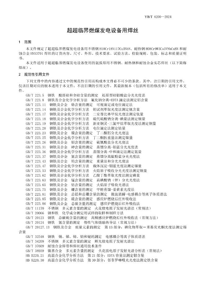 YB/T 6200-2024 超超临界燃煤发电设备用焊丝