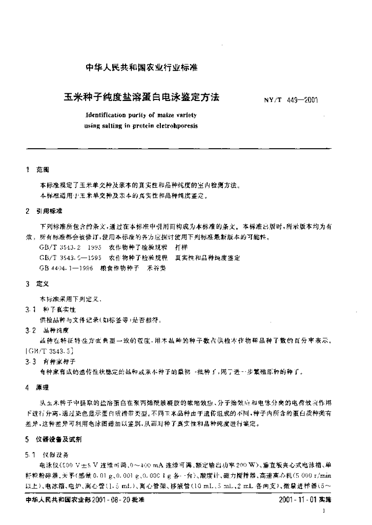 NY/T 449-2001 玉米种子纯度盐溶蛋白电泳鉴定方法