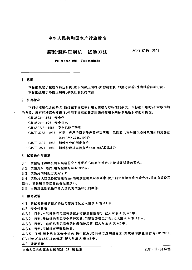 SC/T 6019-2001 颗粒饲料压制机 试验方法