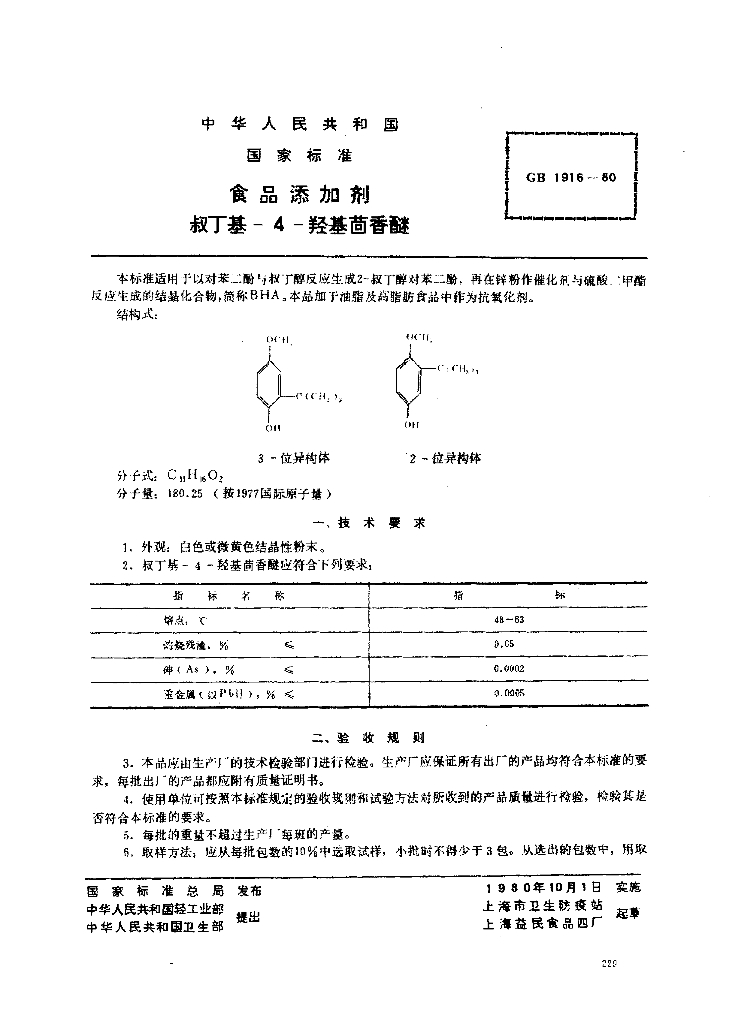 GB 1916-1980 食品添加剂 叔丁基-4-羟基茴香醚