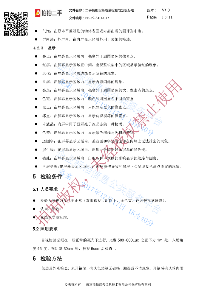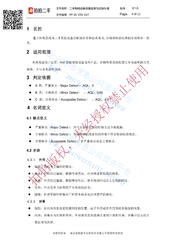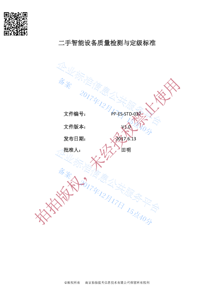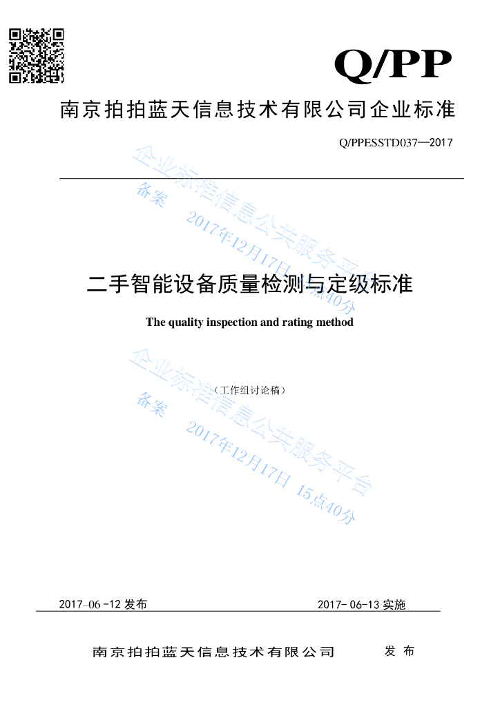 Q/PPESSTD 037-2017 二手智能设备质量检测与定级标准