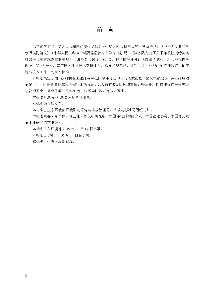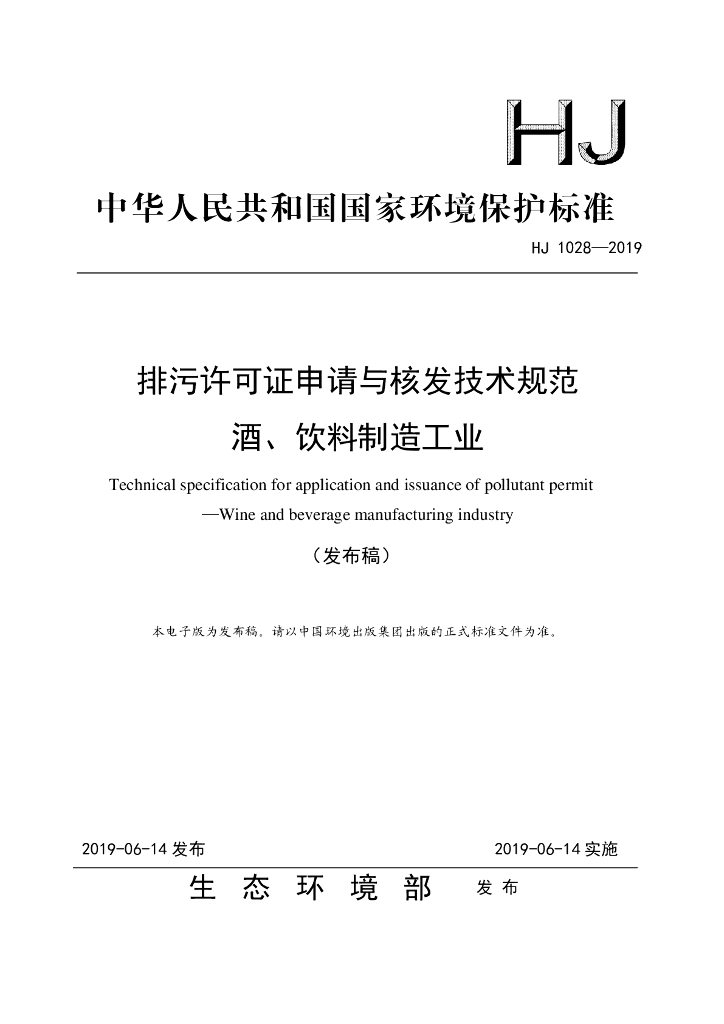 HJ 1028-2019 排污许可证申请与核发技术规范酒、饮料制造工业