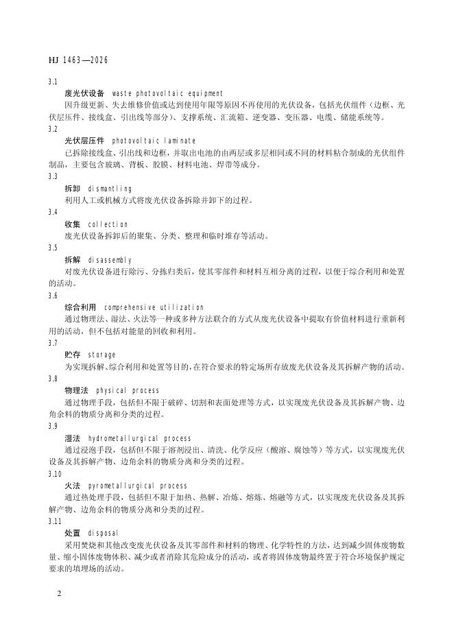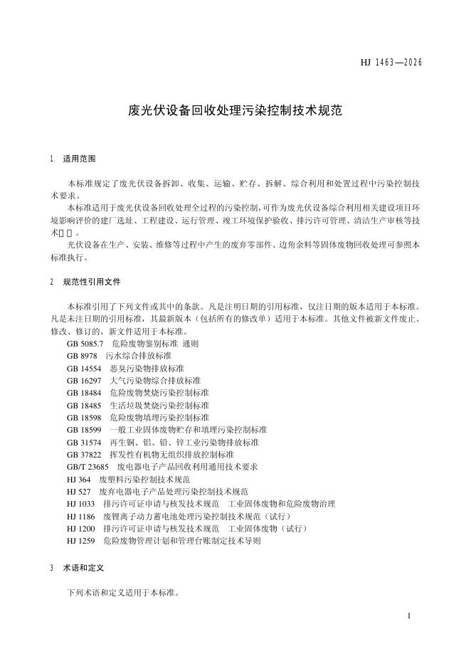 HJ 1463-2026 废光伏设备回收处理污染控制技术规范