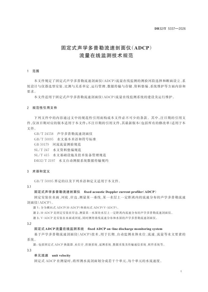 DB32/T 5337-2026 固定式声学多普勒流速剖面仪(ADCP)流量在线监测技术规范