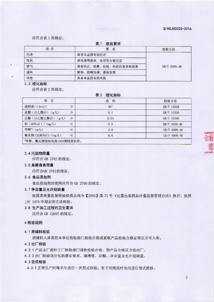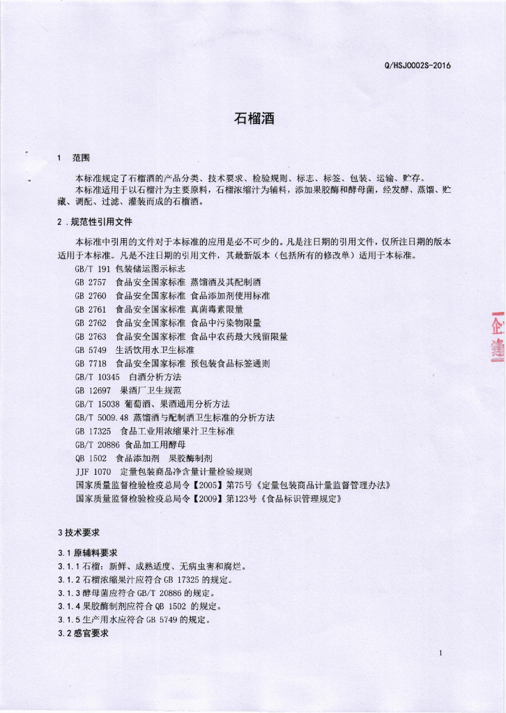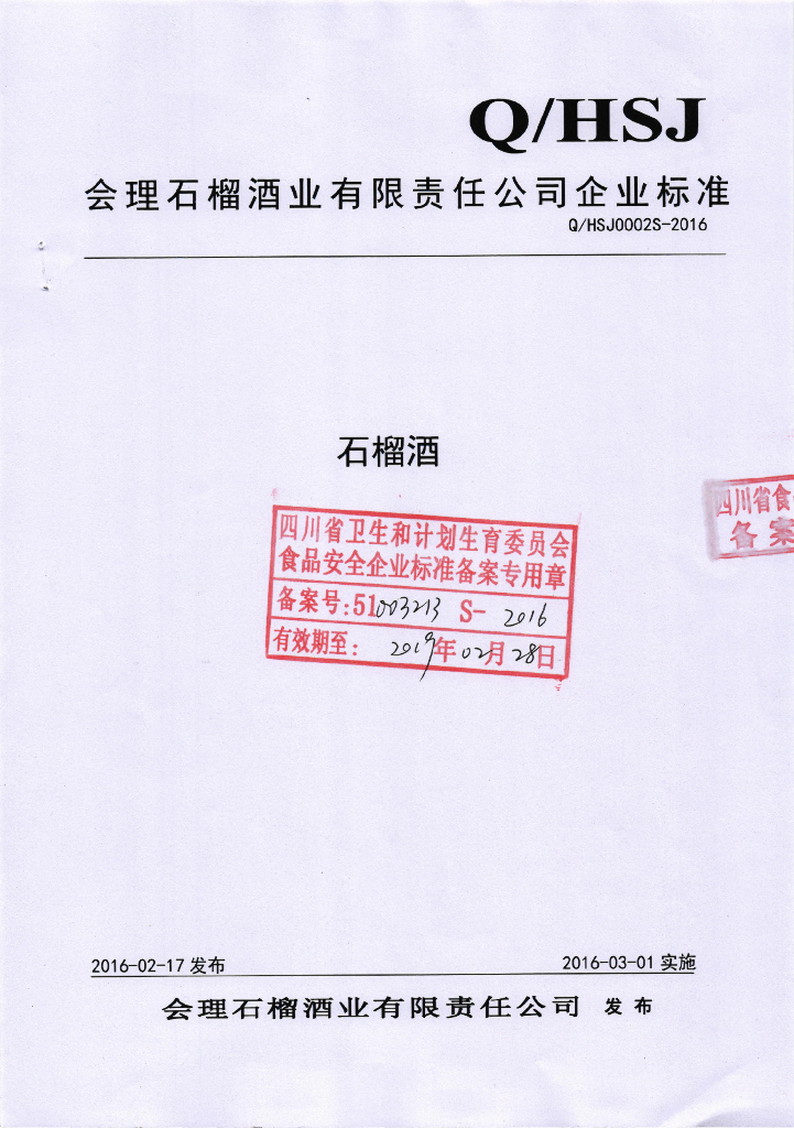 Q/HSJ 0002S-2016 会理石榴酒业有限责任公司 石榴酒