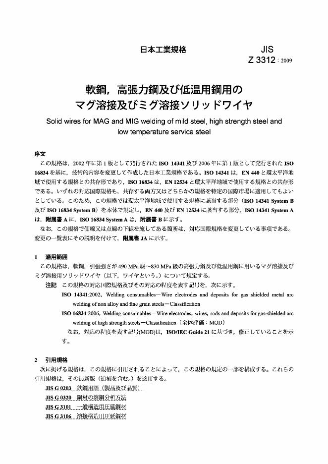 JIS Z3312-2009 低碳钢及高强度钢用金属极活性气体保护电弧实心