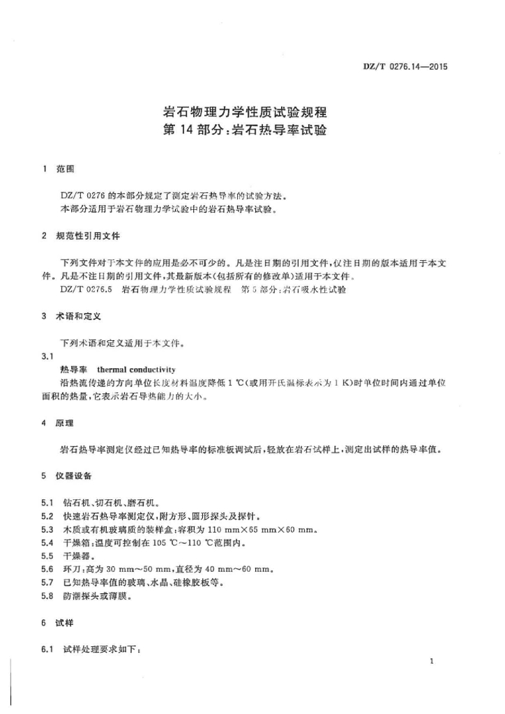 DZ/T 0276.14-2015 岩石物理力学性质试验规程 第14部分:岩石热导率试验
