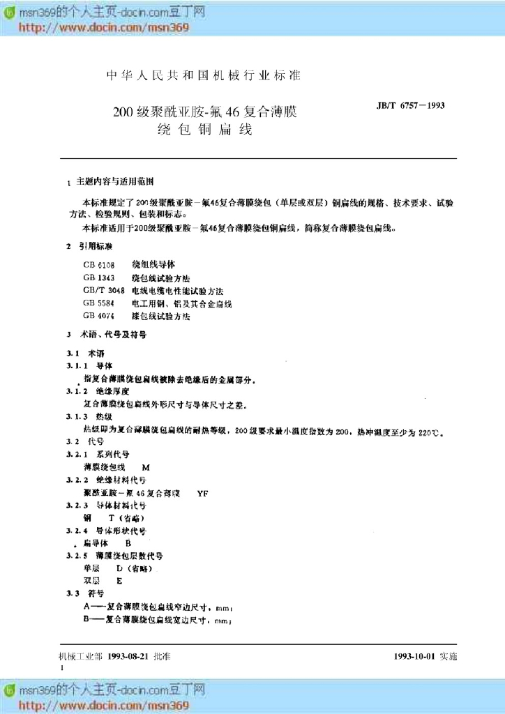 JB/T 6757-1993 200级聚酰亚胺-氣46复合薄膜绕包铜扁线