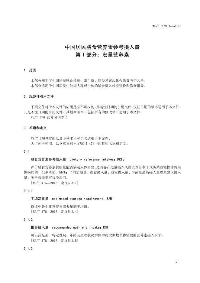 WS/T 578.1-2017 中国居民膳食营养素参考摄入量 第1部分:宏量营养素