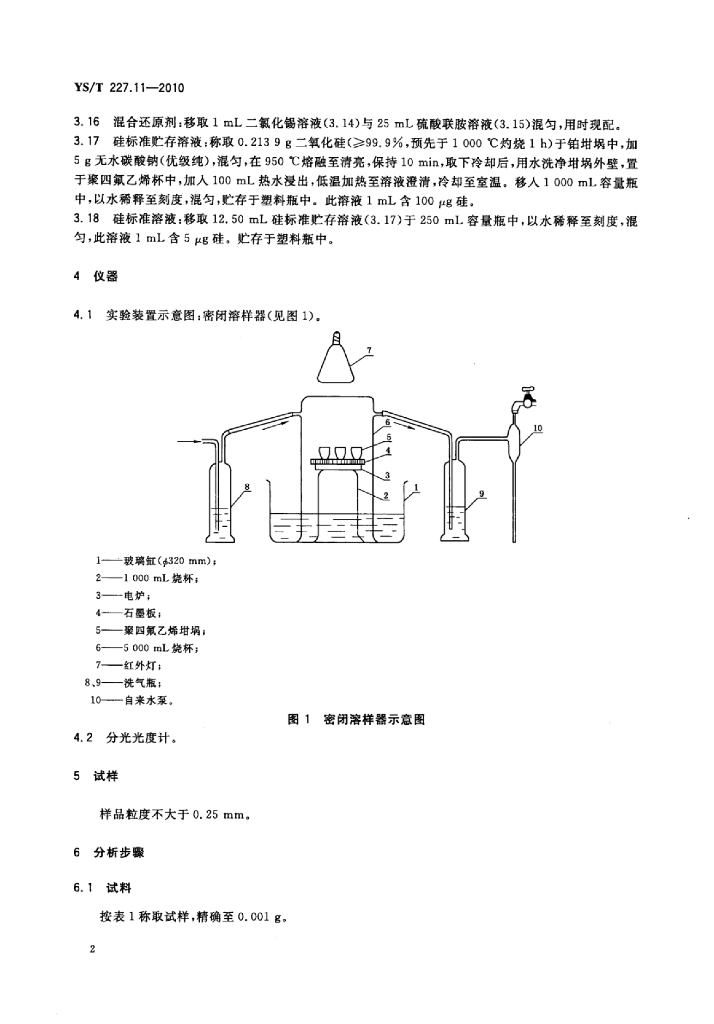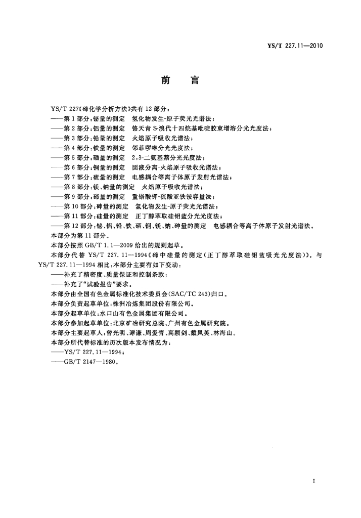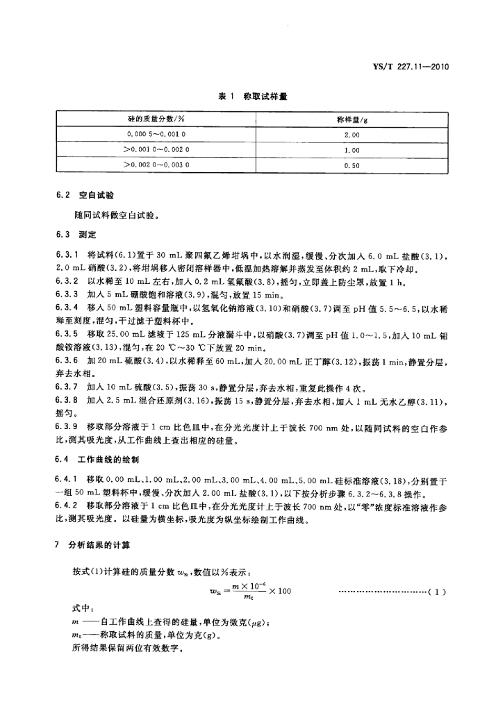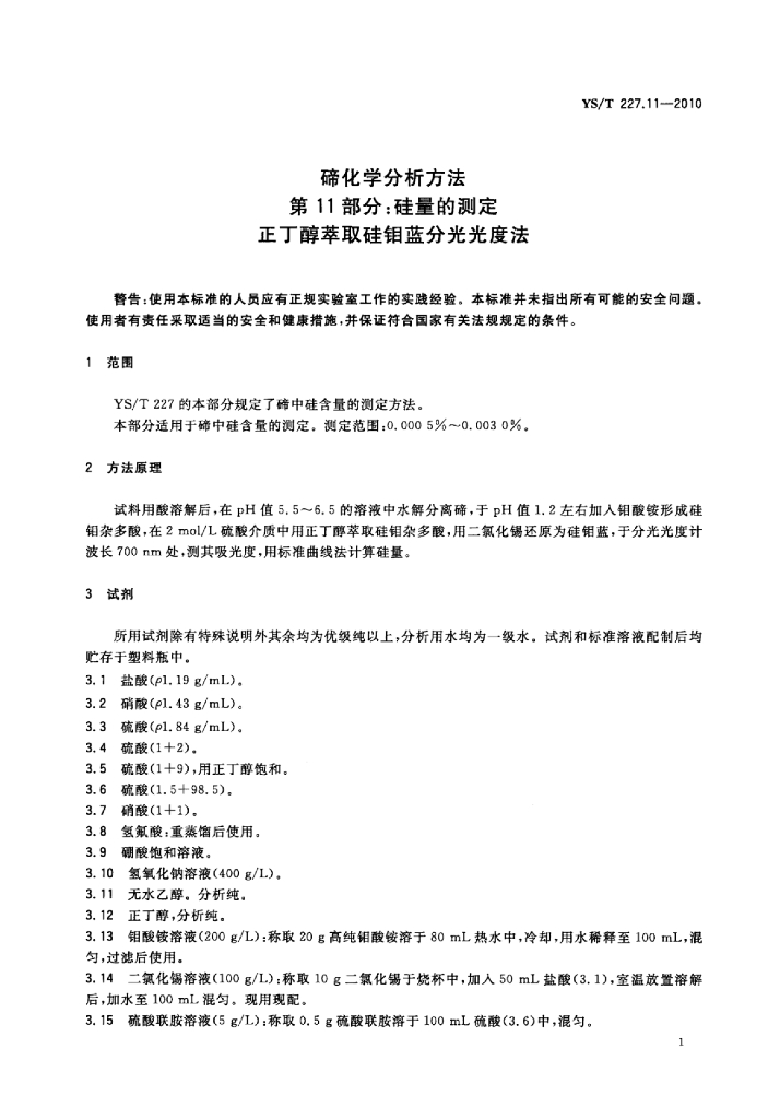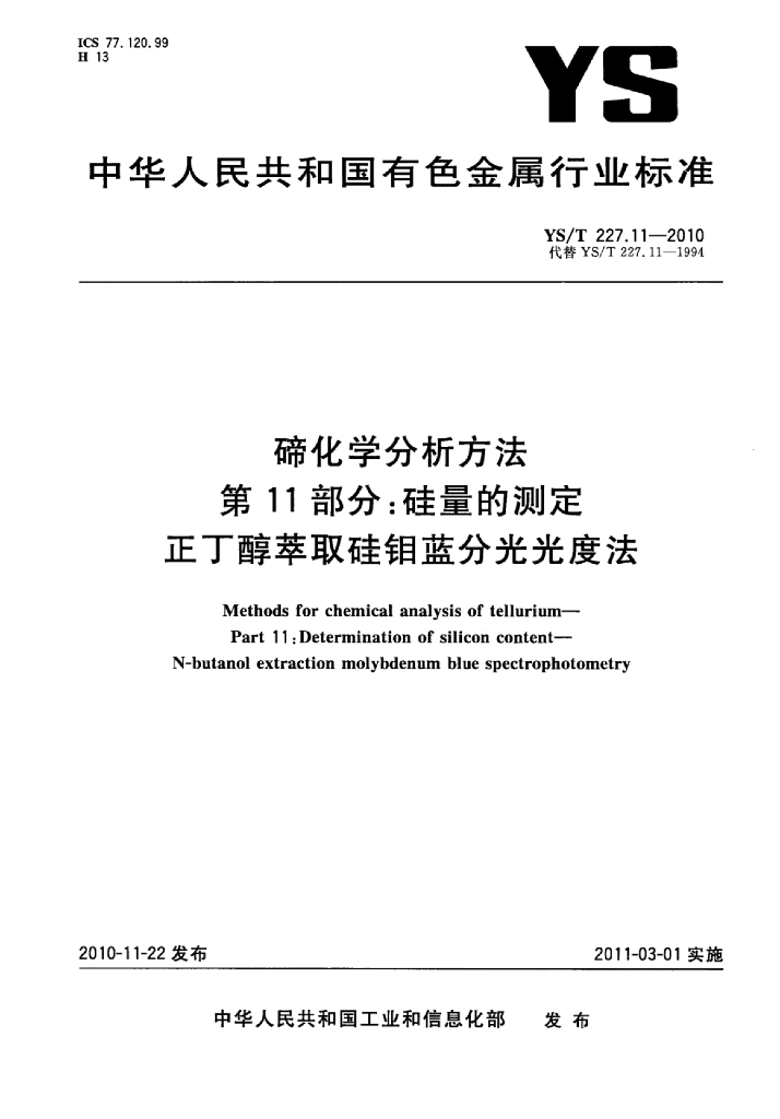 YS/T 227.11-2010 碲化学分析方法 第11部分:硅量的测定正丁醇萃取硅钼蓝分光光度法